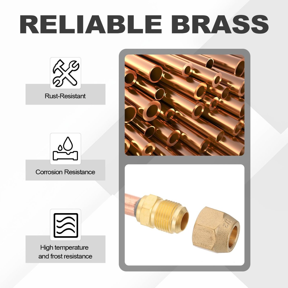 Specifications: Color: Brass Tone, Copper Tone; Material: Brass, Copper; Male Thread Size: 1/2" SAE; Tube Part Length: 68mm / 2.68inch; Copper tube ID: 12.7mm / 1/2 inch; Overall Length: 103mm / 4.06 inch; Packing List: 1 x Air Conditioner flare connector with brass nut.. Advantages: 1. Made from brass material for excellent corrosion resistance and strength.; 2. 45-degree flare connection will make sure good sealing.; 3. It comes with brass flare nut for easy connection.. Instruction: Easy to use, connect the threaded end with a flared copper pipe and tighten with the flare nut, and weld the other end to a copper pipe.. Application: The brass pipe fitting is suitable for copper pipe connection and extention, widely used for air conditioner indoor unit , HVAC Systems, hydraulic applications, A/C mini split unit, refrigeration systems etc..