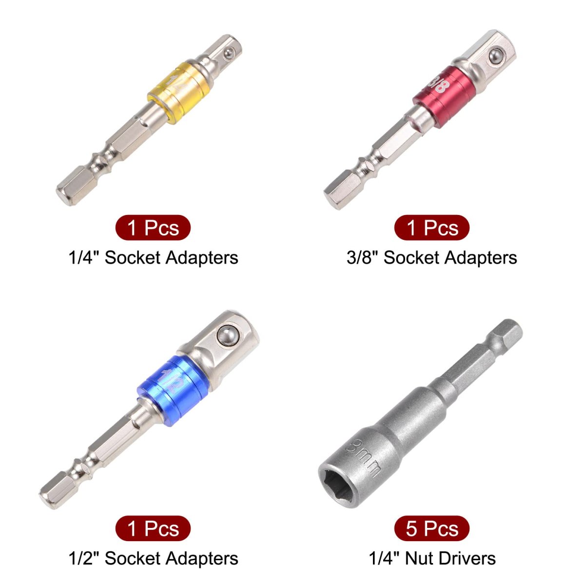 Size3Pcs Socket Adapters (1/4", 3/8" and 1/2" drive adapter and each with a 1/4 inch hex shank driver socket wrench adapter set ),5Pcs Nut Drivers(8mm nut driver, 65mm (2.5-inch) total length.). MaterialHigh carbon steel, chrome vanadium steel increase hardness and corrosion resistance.. Secure HoldSpring-loaded ball at male end retains sockets securely and prevents them from dropping.. Multifunctionused in the installation of pneumatic screwdriver, electric screwdriver, pneumatic drill, manual screwdriver and other installation for the hexagonal tool.. ApplicationWidely used in household DIY, woodworking, professional machine repairing, etc..Other fine products