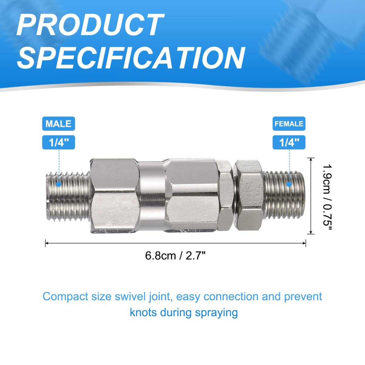 Size: Approx 2.7" x0.75"/6.8CM x1.9CM(L xW).Sprayer Joint 1/4 inch male - 1/4 inch male is for airless spray gun and most airless paint spray gun and airless paint hose.. Swivel joint is made of stainless steel material,heat and cold resistance solid, rustless, durable to use even in harsh operating conditions.. The Rotary Joint can be rotated 360 degrees to reduce wrist pressure.Swivel joint is compact size, easy connection and no knots when during spraying.. Note: There are grooves inside the swivel joint. If your spray gun or fitting is flat, the seal is not perfect. It is recommended that you check before use to achieve leak-free operation.. Sprayer Connector 360 Degree Swivel Stainless Steel is suitable for Airless High Pressure, Spray Gun Hose, Swivel Connector Fittings also for Paint Sprayer Hose..Other fine products
