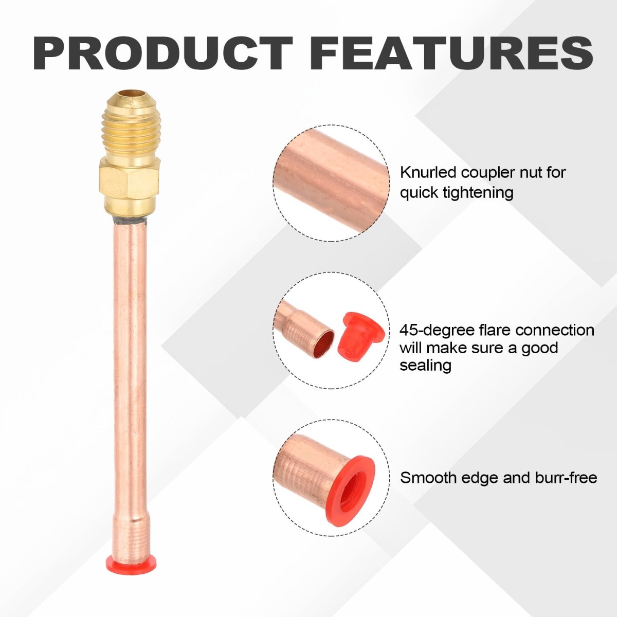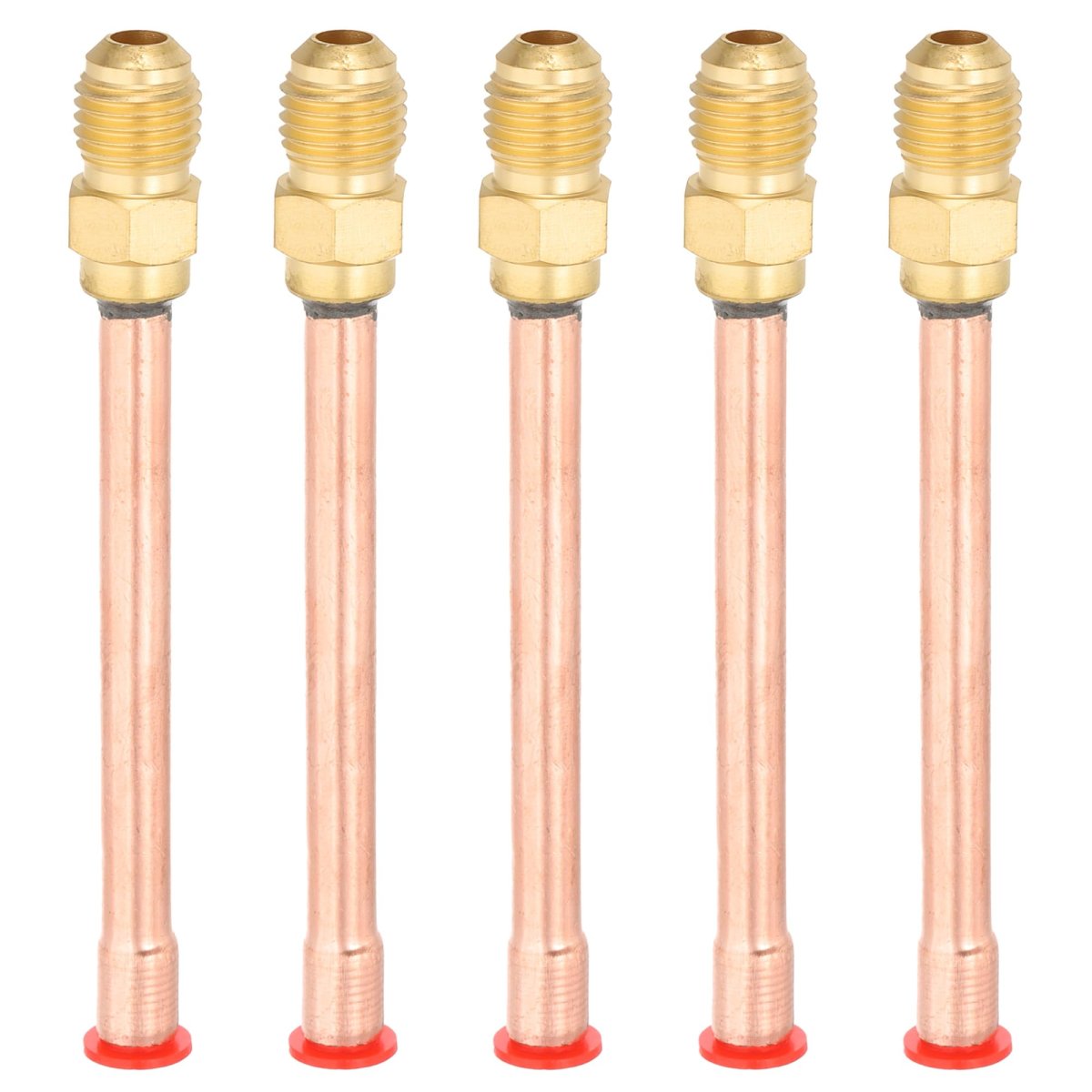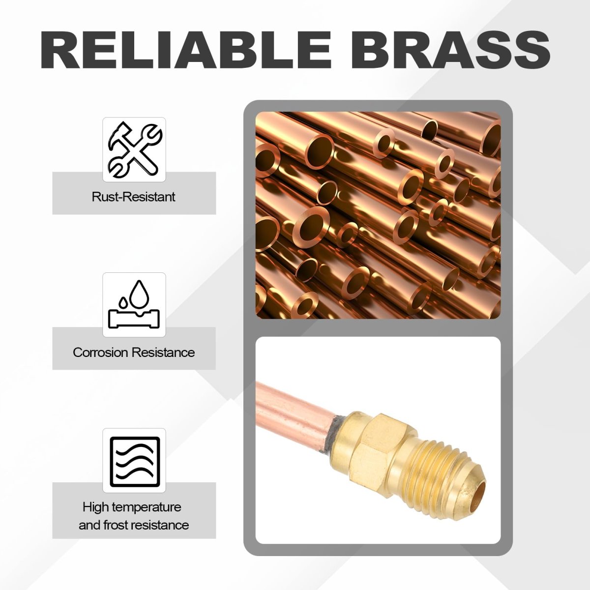 Specifications: Color: Brass Tone, Copper Tone; Material: Brass, Copper; Male Thread Size: 1/4" SAE; Tube Part Length: 69mm / 2.72inch; Copper tube ID: 6.35mm / 1/4 inch; Overall Length: 91mm / 3.58 inch; Packing List: 5 x Air Conditioner flare connector.. Advantages: 1. Made from brass material for excellent corrosion resistance and strength.; 2. 45-degree flare connection will make sure good sealing.. Instruction: Easy to use, connect the threaded end with a flared copper pipe and tighten with the flare nut (not included), and weld the other end to a copper pipe.. Application: The brass pipe fitting is suitable for copper pipe connection and extention, widely used for air conditioner indoor unit , HVAC Systems, hydraulic applications, A/C mini split unit, refrigeration systems etc..Other fine products