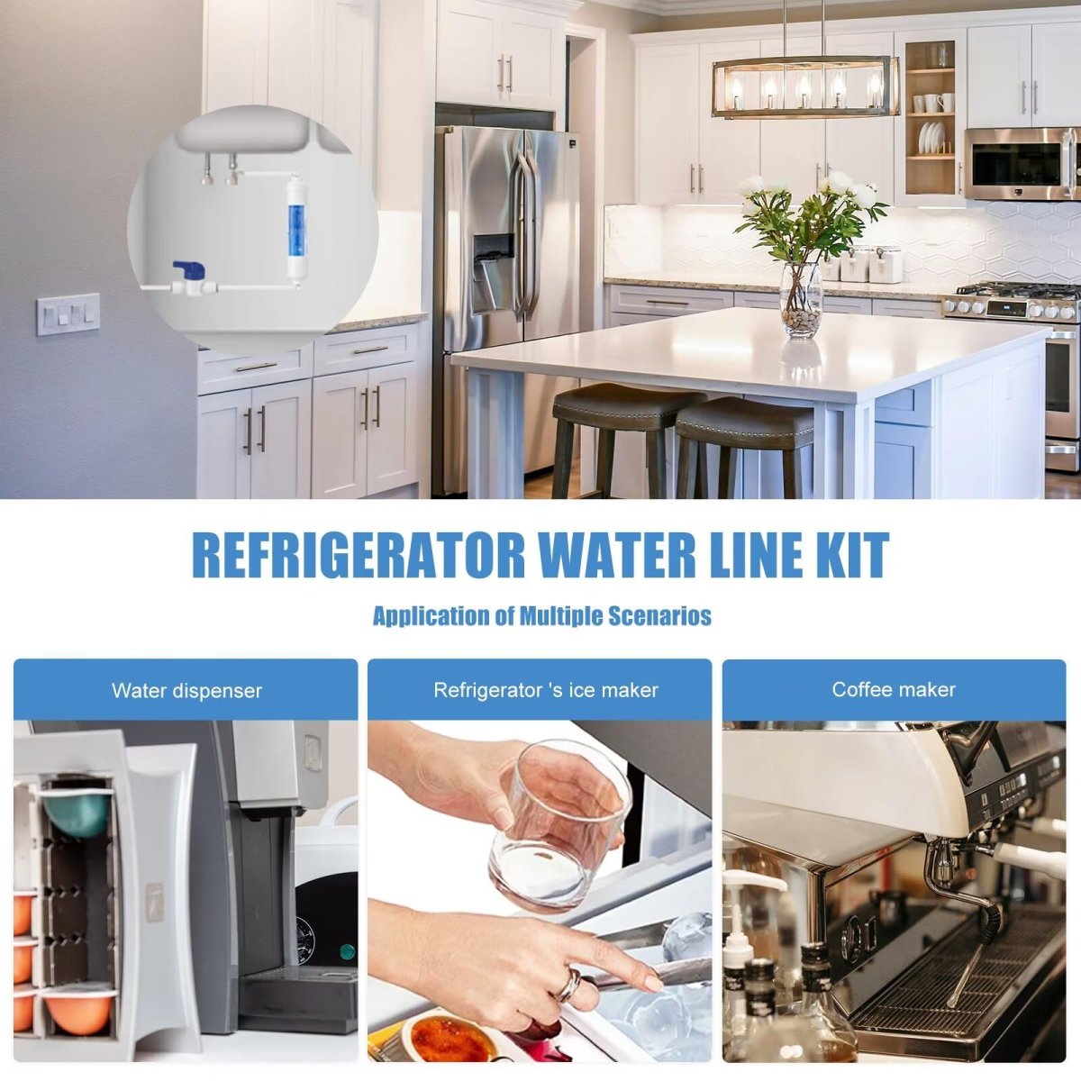 Fitment: 1/4" Water Line Connection Kit - For Reverse Osmosis Systems and Filter Connections. Complete Kit - 32 FT RO1/4 inch OD tubing x 1,1/4" shut off valve x 1,1/4" adapter x 1,1/4" straight fitting x 1,1/4" to 3/8" straight fitting x 1,1/4" x 1/4" x 1/4" tee (for 1/4" outlet water tubing) x 1, 3/8" x 1/4" x 3/8" tee (for 3/8" outlet water tubing) x 1,1/4"OD elbow guard x 2,Professional tube cutter x 1,1/4" compression fitting set x 2(Compression Insert x 2 ,Compression Sleeve x 2 ,Brass Compression nut x2). Universal Refrigerator Compatibility - Works with most major brands including for GE, for LG, for Whirlpool, for Samsung, for Frigidaire refrigerators and ice makers. Multiple System Connectivity - Connects to reverse osmosis systems, under-sink filters, and standard water supplies with both 1/4" and 3/8" outlet compatibility. Leak-Prevention Design - Professional push-to-connect fittings and included tube cutter ensure smooth, even cuts and secure connections without tools required.Other fine products