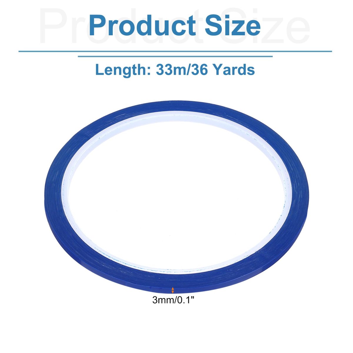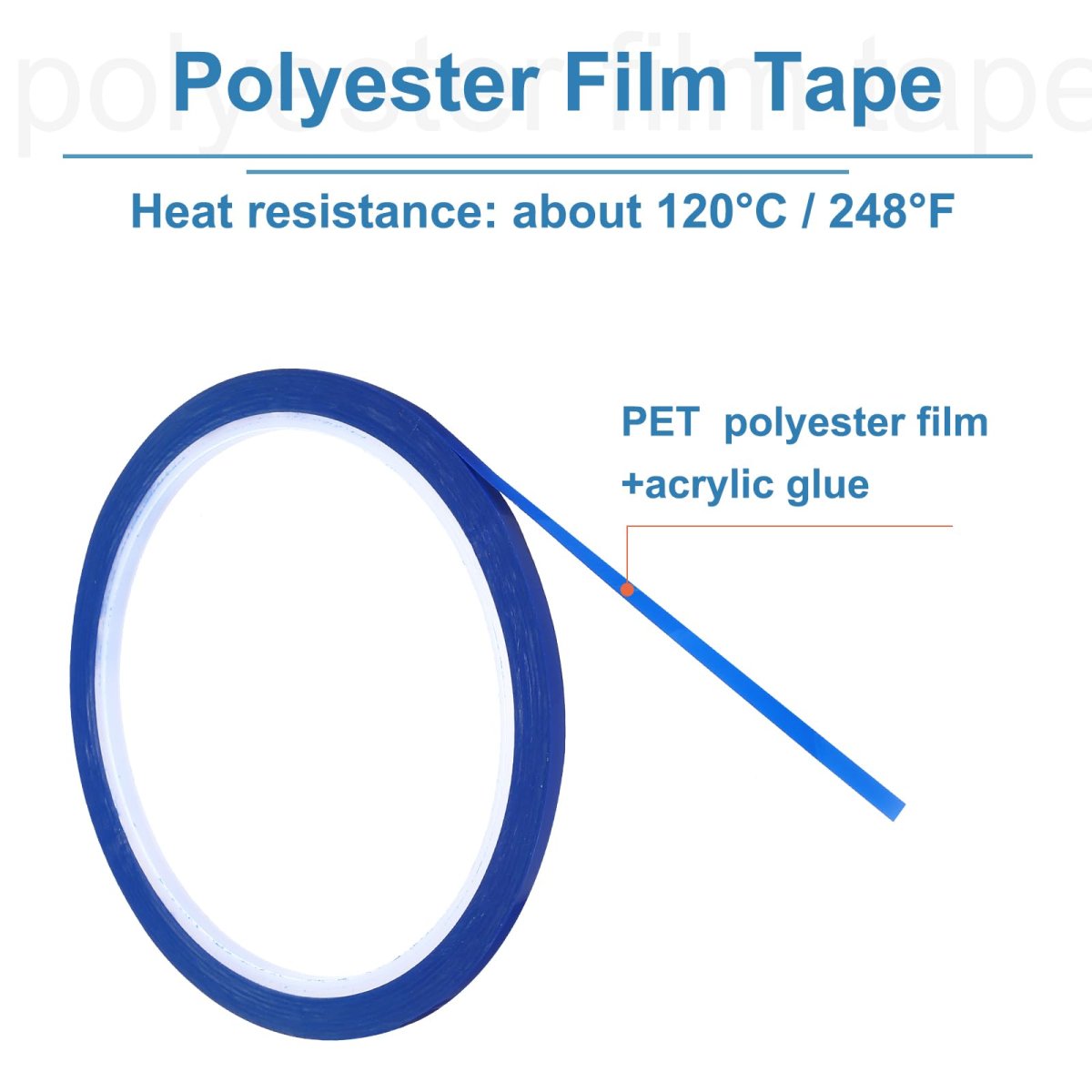Heat-resistant tape polyester film tape. Adhesive made of acrylic acid, high viscosity, waterproof, not easy to corrode and age, single-sided self-adhesive design, no residue, easy to use, with excellent electrical insulation performance and high temperature resistance.. Color:Blue;Width: 3mm/0.1 Inch;Length: 33m/36 Yards;Thickness: about 0.06mm/0.002inch;Heat resistance: about 120C/ 248F;Type: One-side self-adhesive design;Material: PET;Package Content:1 Rolls x Whiteboard Tape;. high temperature tape is very suitable for protecting electronic products and can be used for sensitive printed circuit board (PCB) components such as circuit board repair, welding, 3D printing, etc. Widely used as high temperature tape for transformers, motors, coils, capacitors and variable frequency power supplies in the electronics industry.. The surface of the tape is wear-resistant and pull-resistant, not easy to break and deform, and it is not easy to leave residual glue after tearing; therefore, it is also suitable for marking and positioning on workbenches, desktops, and floors.. Colored pet tape 5S desktop identification positioning tape is also suitable for ground area division, drawing board table application, park venue use, manual production use, shelf classification use, wall graphic DIY.