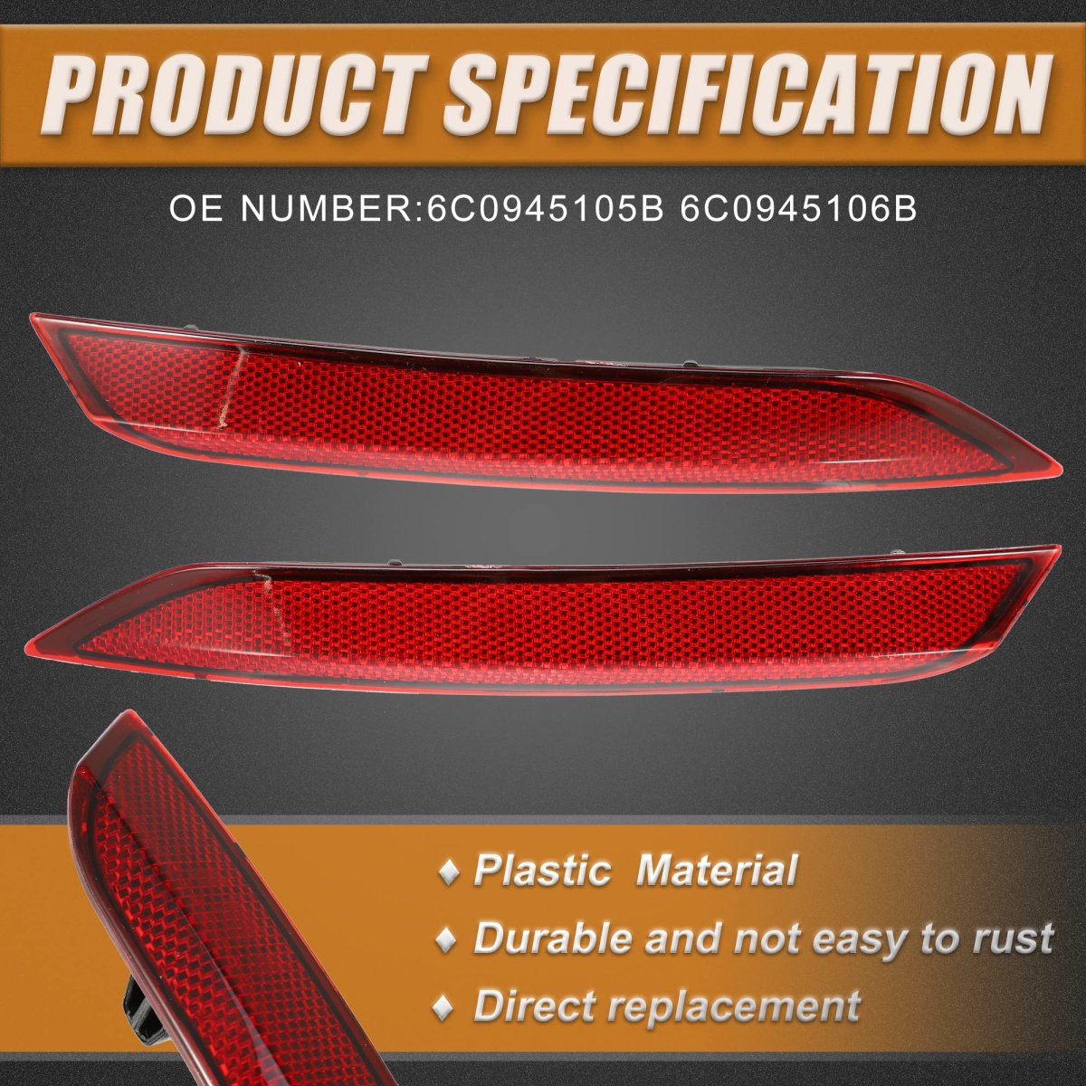 Fitment: for VW POLO 2014-2017. OE Number: 6C0945105B 6C0945106B. Waterproof and Quality Material: Quality plastic lens, anti scratch, no faded with long time exposure and can adapt to all kind of extreme weather, no condensation inside after heavy rain or car wash anymore, and can be used for a long time.. Easy to install: Waterproof and shock resistant. No modification is necessary, plug and play.. Package Includes: 1 Pair x Rear Bumper Reflector.