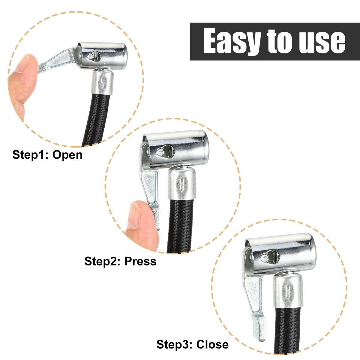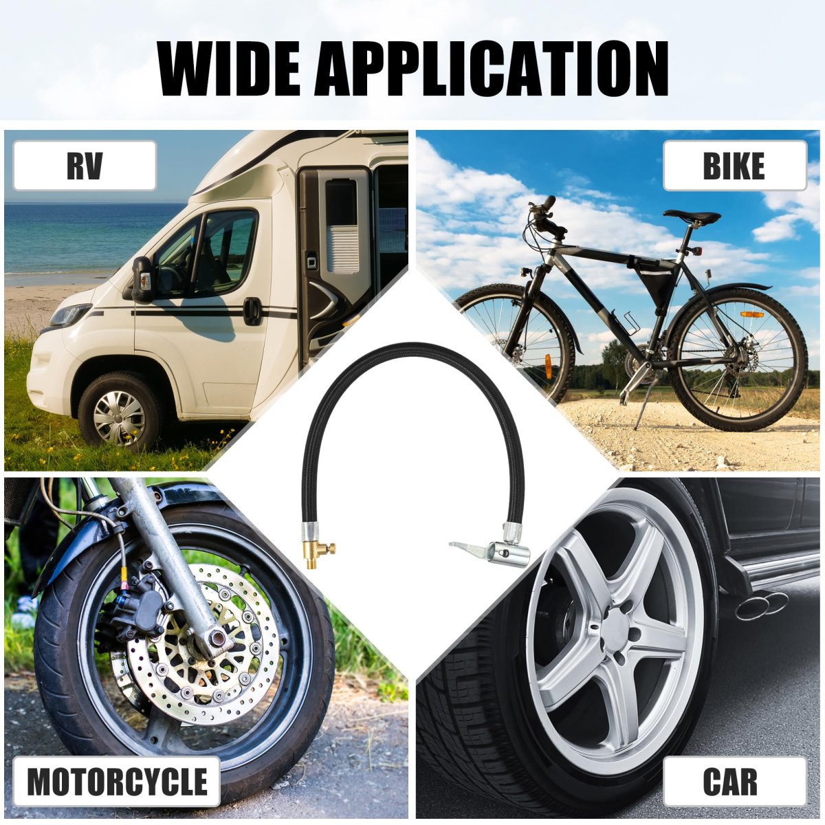 The tire inflator chuck adapter can connect to your tire quickly for speedy inflation, suitable for bike, motorcycle, car air fill. The adapter is with quick connect and release function.. Good tight seal lock on tire chuck, corrosion resistant, wear resistance, good performance, durable and flexible. The tire chuck is made of durable metal and a heat resistant hose, durable and not easily damaged.. No additional tool is required, directly connect the tire. Open flow thumb press tire chuck, easy and quick hands free inflation. Deflatable function is used to adjust the tire pressure of the car tire.. Using Step: Screw adapter end onto original inflator hose, press to clamp adapter head onto tire valve, start the inflator for a quickly and none leaking inflation.. Package Included: 1 x Valve Extension Hose, 2 x Brass Clip-on Connectors..Other fine products