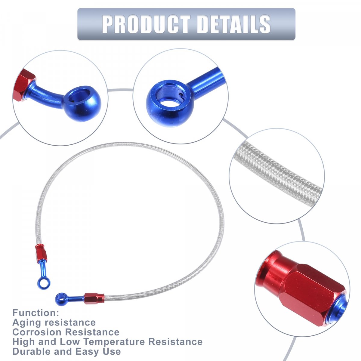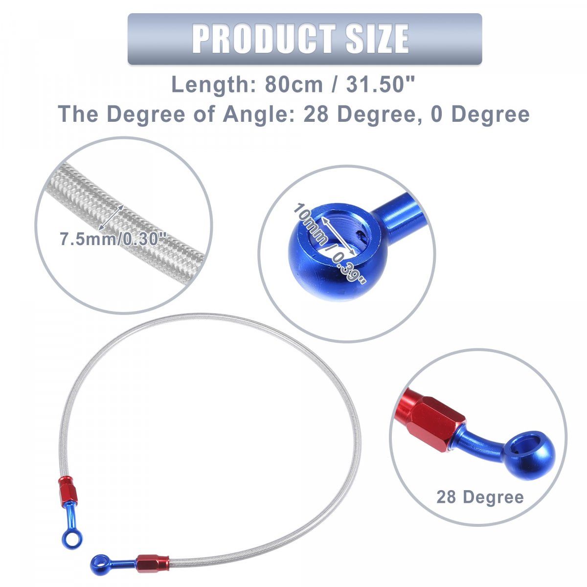 Specifications: Material: Aluminum, Rubber, Placement on Vehicle: Front, Color: Silver Tone, Outer Diameter of Pipe: 7.5mm / 0.30", Fittings Inner Diameter: 10mm / 0.39", Length: 80cm / 31.50", The Degree of Angle: 28 Degree, 0 Degree.. Application: These brake lines provide brake pressure to the brake calipers, improve brake sensitivity and braking force, and effectively shorten the braking distance.. Material: The clutch oil hoses are made of aluminum and rubber, to ensure durability and safety, heat resistance, waterproof, and anti-corrosion.. Installation: Easy to install, just direct fit it in your engine, our front gas clutch pipe provides easy installation and use.. Package Includes: 1 Pcs Motorcycle Brake Hose Oil Line Pipe, 4 Pcs Washers..Other fine products