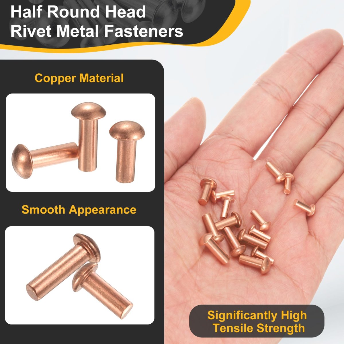 Size100 Pcs x Copper Solid Rivets, Shank Diameter(D): 4mm/0.16inch, Shank Length(L): 10mm/0.39inch, Head Diameter(D): 7mm/0.28inch, Head Thickness(T): 3mm/0.12inch. MaterialMade of copper material, Significantly high tensile strength, it ensures that our semi-circular head rivets can endure significant mechanical stress without deformation or breakage, Additionally, the copper's inherent corrosion resistance offers superior protection against environmental factors such as moisture.. Easy InstallationThese half-round head rivets are simple to install with the right tools. Just align the holes, insert the rivet, and use a riveting tool to secure it in place. No complex techniques or advanced skills required!. Wide ApplicationsSuitable for metal fabrication, automotive repairs, furniture assembly, machinery construction, and more. Their strong hold and sleek design make them well-suited for functional and aesthetic applications.. NoteLight shooting and different displays may cause the color of the item in the picture to a slightly different from the real thing..Other fine products