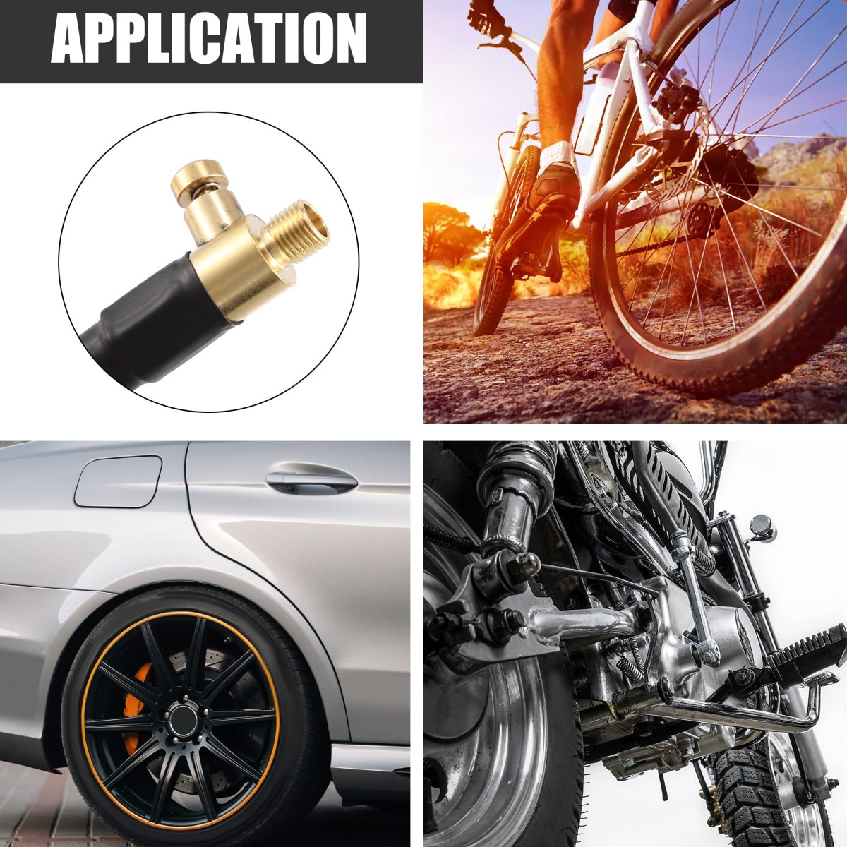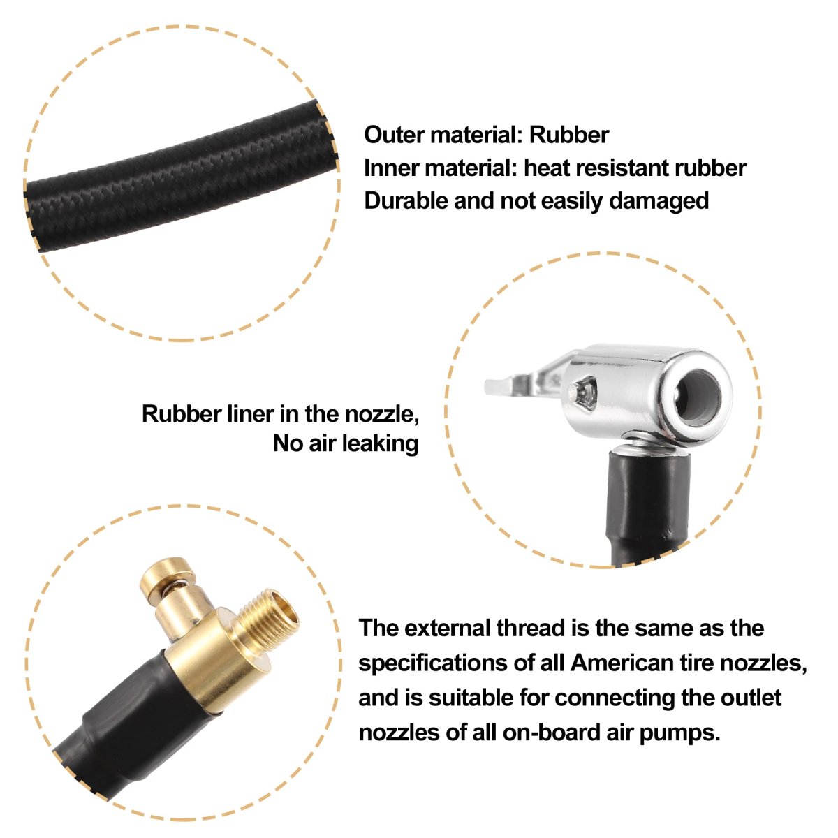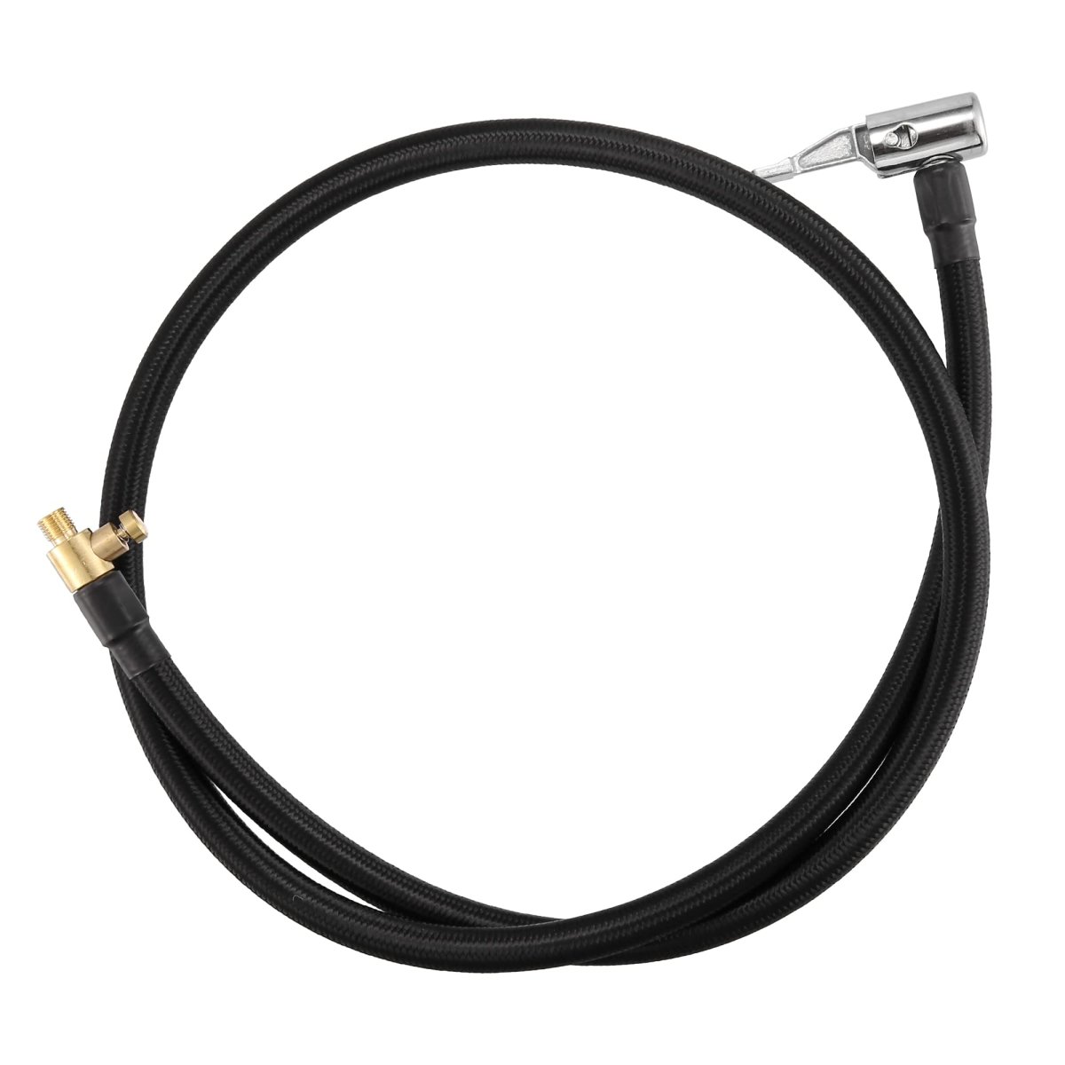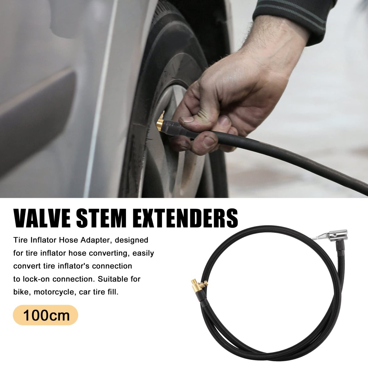 The tire inflator adapter is suitable for bike, motorcycle, and car air fill. The adapter is with a release function.. Made of good material, corrosion resistant, wear resistant, good performance, durable and flexible. The tire air inflator hose adapter is made of durable good material hose, durable and not easily damaged.. No additional tool is required, directly connect the tire, easy and quick hands free inflation.. Using Step: Screw the adapter end onto the original inflator hose, screw the other end of the adapter onto the tire valve, and start the inflator for quick and no leaking inflation.. Package: 1 x 100cm Valve Stem Extender..Other fine products