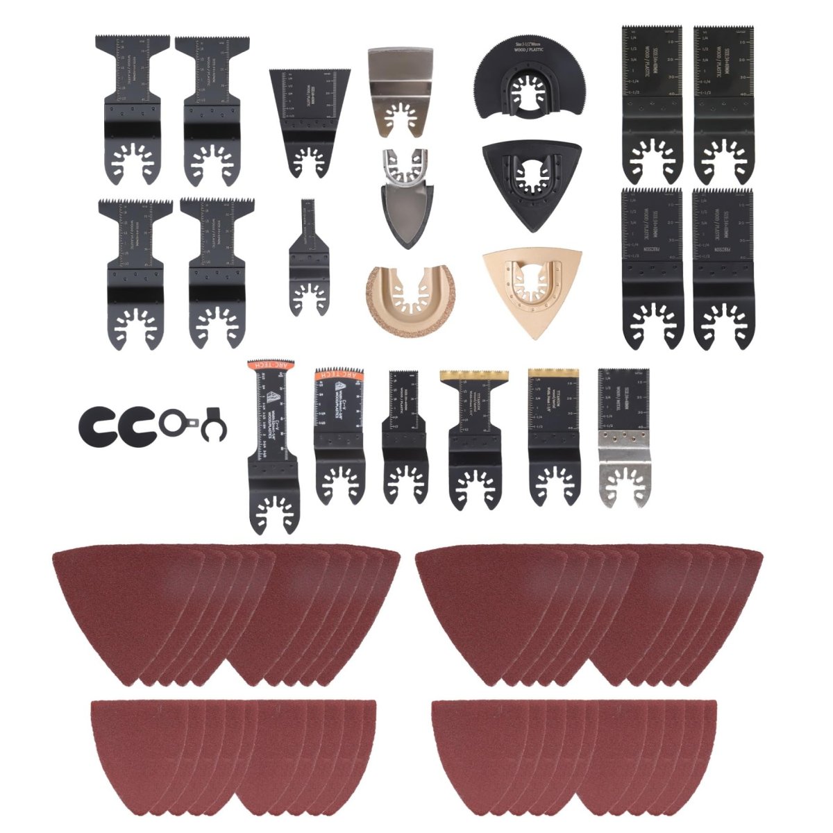 Complete Set: 106-piece universal multi-function tool blade set covering the most commonly used sizes, plus 80 sanding sheetsperfectly tailored to your work needs.. Premium Material: The multi-purpose vibrating blade is crafted from high-speed steel, offering significantly enhanced hardness and heat resistance compared to standard blades. This delivers effortless, swift cutting performance while extending service life.. Wide Compatibility: Featuring a universal interface system, these blades enable tool-free quick replacement and work with most major oscillating tool brands. Versatile Applications: These blades are specifically designed for woodworking and metal cutting, delivering outstanding performance in home renovation, plumbing, metal/wood fabrication, emergency rescue operations, and other applications..Other fine products