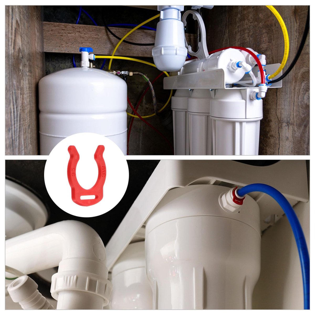 [Tube Quick Connect] - Fit Tube Diameter: 3/8 inches; Package: 10Pcs. We have multiple sizes to match hoses, pipes, or tubes of various widths, and enough quantity for your use or replacement. [Material] - The quick connect lock with Plastic materials, with good performance in heatproof and cold-resistant, able to work on -20105; Anti aging, corrosion resistance, weak acid, and alkali resistance.. [Easy to Install and Replace] - Quickly connect and disconnect without additional tools. It provides a fast and easy way to prevent leaks: place the clamp opening behind the U-shaped clip, gently press down, and it will securely snap into place.. [Design For Your Home] - These quick-connect fitting replacement parts are designed to prevent leaks in water supply systems, this product requires just a small clamp to effectively stop leaks caused by loose connections and strengthen the RO systems.. [Compatible Tube ] - Compatible for standard quick-connect fittings used on most reverse osmosis systems and inline filter housings. They prevent accidental slippage of the retaining/release parts of the tube fittings or valves, which could otherwise lead to the plastic tubing becoming detached..