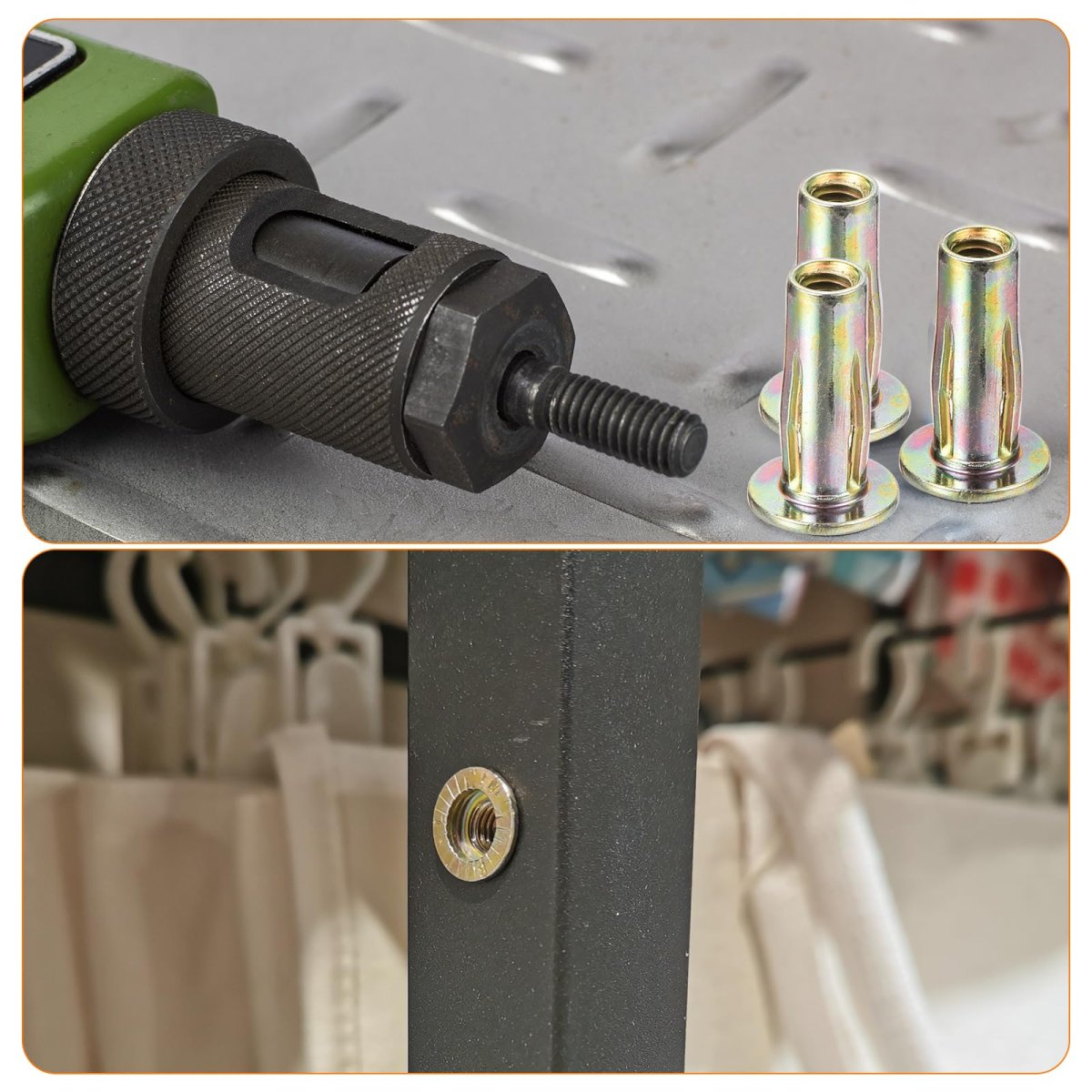 Specification: Material: Carbon Steel; Thread Size: M5-0.8; Total Length: 22mm/0.87inch; Head Diameter: 12.7mm/0.5inch; Body Diameter: 7.5mm/0.3inch; Head Height: 1mm/0.04inch; Drill Hole Size: 7.5mm/0.3inch; Package Content: 10Pcs x Rivet Nuts. [Materials]: Crafted from durable carbon steel, these rivet nuts offer strength and reliability for long-lasting performance. Their zinc coating resists corrosion and enhances their appearance, making them suitable for a range of applications.. [Features]: The rivet nuts' multi-grip, pre-bulbed flat head, and knurled body design provide stable and secure attachment. This design simplifies installation and reduces rotation, resulting in a stronger fixation with minimal effort.. [Easy to use]: Rivet nuts require riveting tools, either pneumatic or manual. Create a hole matching the rivet nut's mounting hole size, insert the rivet nut, and use the riveting tool to secure the locking nut.. [Application]: Rivet nuts are commonly used in metal fabrication industries, including metal sheets and pipes. They are also widely used in the assembly of products such as cars, aircraft, trains, refrigeration equipment, switches, instruments, furniture, elevators, and decorative items..Other fine products