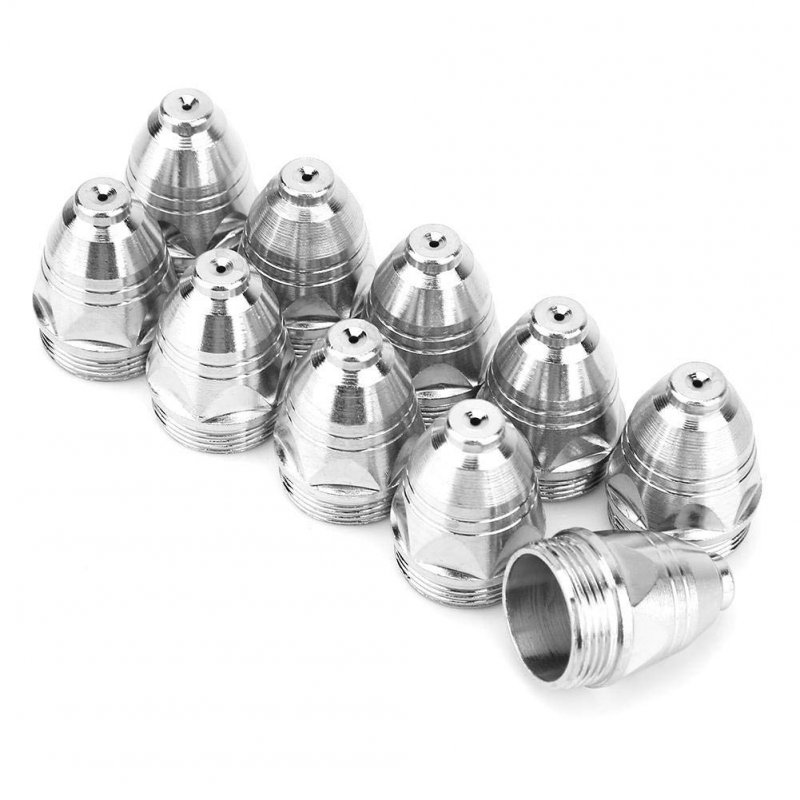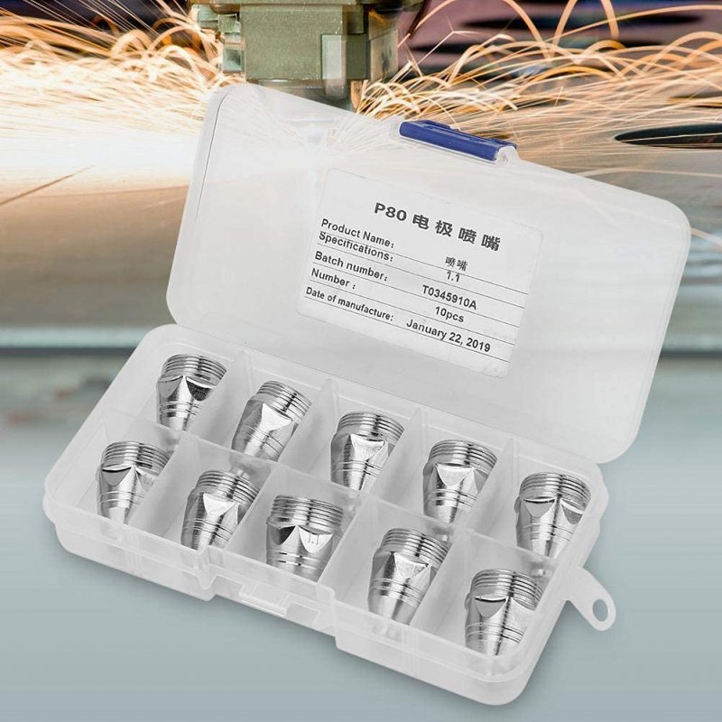 SMOOTH SURFACE: The consumable plasma nozzle features smooth incision, narrow slit, small thermal deformation, and is easy to clean slag. HIGH EFFICIENCY: Made of premium metal, the air plasma cutting torch tip has high cutting efficiency.. TWO OPTIONS: There two options for you, you can choose 10 pieces 1.1mm nozzles or 5 pieces nozzles plus 5 pieces electrode.. GREAT REPLACEMENT: This plasma nozzle can be great replacement of the worn one, and the quantity is enough for your daily use.. SUITABLE FOR: P80 electrode nozzle is used for air plasma cutting machine, which can cut medium and thin metal sheet..
