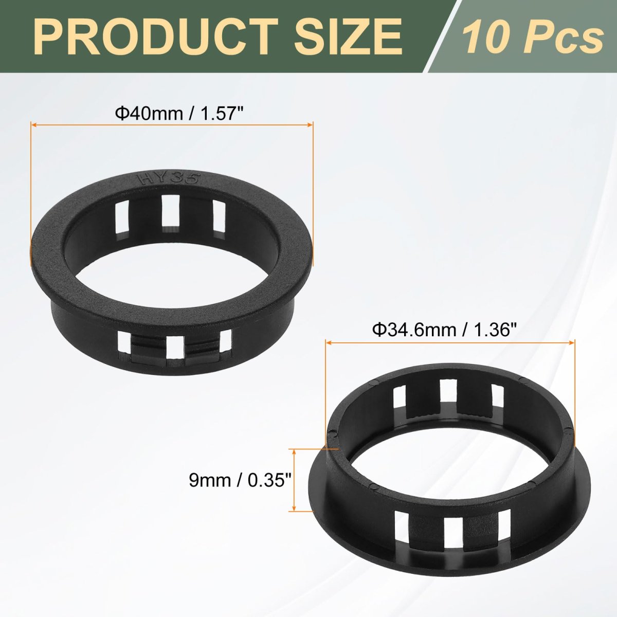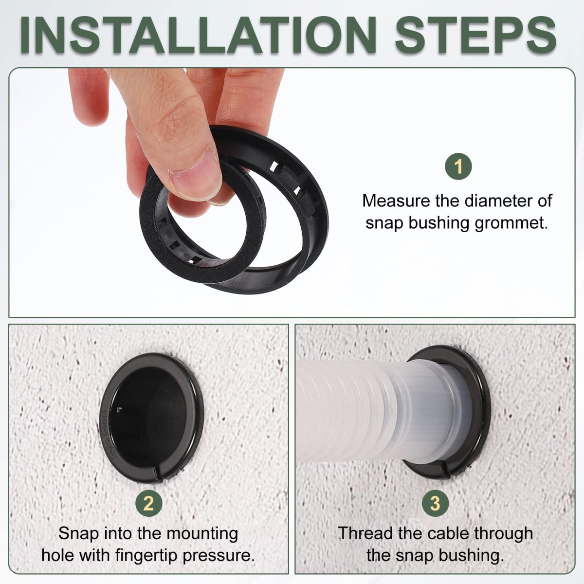 [SIZE&PACKAGE]: Mounting Hole Diameter: 35mm / 1-3/8inch; Upper Outer Diameter: 40mm / 1.57inch; Lower Outer Diameter: 34.6mm / 1.36inch; Total Height: 9mm / 0.35inch; Package: 10Pcs x Snap Bushing Grommets. [MATERIAL]: The cable grommets are made of polypropylene plastic, which is light, wear-resistant, not easy to break, waterproof, has good insulation performance, and can be used for a long time. [DESIGN]: The cable hose grommet has snaps on both sides, which can be firmly stuck on the installation hole and not easily fall off, effectively preventing the cable from being worn or scratched, and improving safety. [EASY TO INSTALL]: The snap bushing grommets are easy to use and do not require any tools. Simply lock the snap bushing into its mounting hole with fingertip pressure and thread the cable through the snap bushing. [WIDE APPLICATION]: Cable snap bushing grommets are widely used for insulation and mechanical protection of electrical and telecommunication cables, oil pipes, hoses, ropes, and utility lines. Such as power socket boxes, switch boxes, metal boxes, or other enclosures.Other fine products