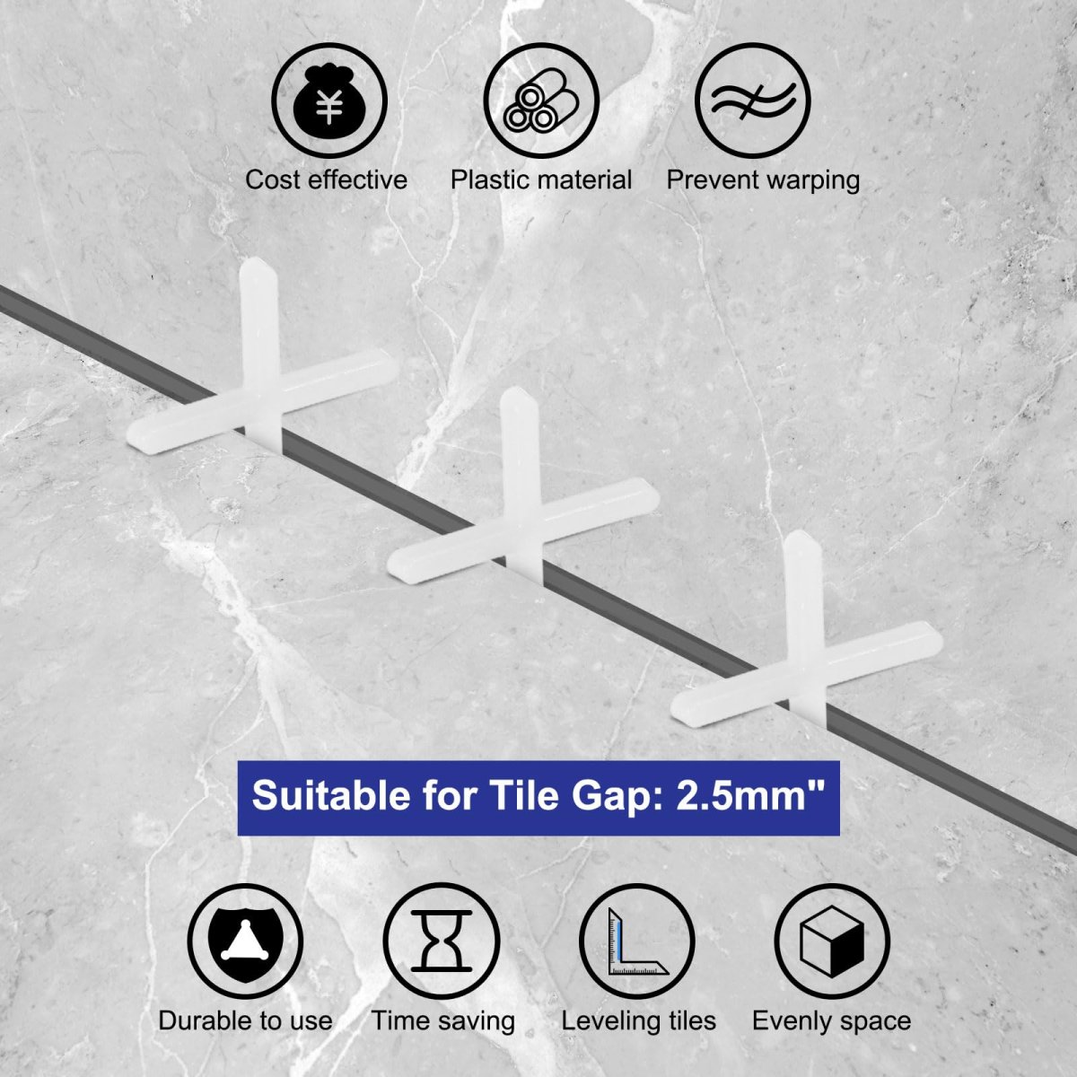 [Material]: Made of sturdy and durable PP plastic material, these tile spacers are not easy to bend or deform, have good performance, and wear resistance, and can be used for a long time. [Tile Pasting Assistant]: The cross tile spacers are used to assist in adjusting the width of the gap between tiles when laying tiles, ensuring that the gaps between tiles are uniform and not easily offset, making tile installation easier, and helping to create a professional and beautiful tile finish. [Easy to Use]: Cross tile spacers are easy to use and install. Just put them between the tiles and press down to fix them in place. They can be reused to help you solve problems such as uneven tile pasting, pasting not flush, slow pasting, etc., making your work more convenient. [Wide Application]: The cross tile spacers can be applied to various tile sizes, are suitable for home construction and decoration, can be used indoors and outdoors, a good helper for wall and floor tile installation, mosaic tile installation, etc.