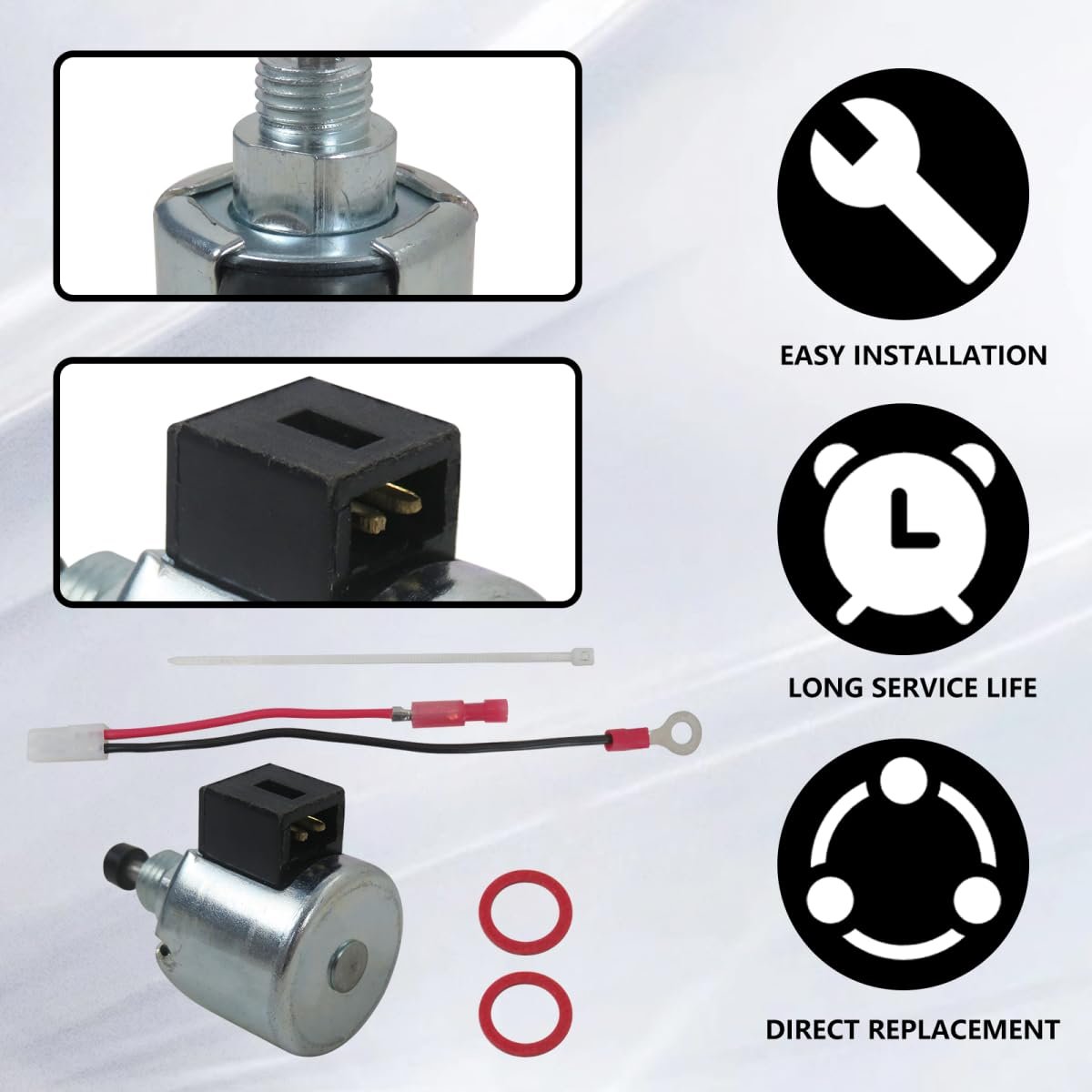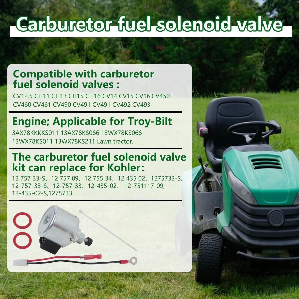 Replacement Part Number: for Kohler 12 757 33-S, 12 757 09, 12 755 34, 12 435 02, 1275733-S, 12-757-33-S, 12-757-33, 12-435-02, 12-757-09,12-435-02-S,1275733; Replace for John Deere STX38 LX255 AM128242 AM128816; Replace for Stens 055-497. Appliacation: for CH11-CH16 and CV11-CV16 with W*lbro carburetors; for Toro Lawn Tractor :72200 74360 74363 74370 74380 74391 74601 74701;For 22HP kohler engine 917.289340; for Kohler 26509 16 HP (11.9 kW) Engine;for 26517 H*sqvarna, 16hp, 11.9kW;26504 16 HP (11.9 kW) Engine;for 26518 Command PRO Engine, for Toro, 16hp, 11.9kW;26510 16 HP (11.9 kW). Application: For Cr*ftsman 917255251 917256541 917256551 917256552 917256580 Lawn Tractor;for 501CV15S-41526 Kohler Engine ,501CV15S-PS41508 Engine. AM128242 Carburetor Fuel Solenoid Compatible for CV12.5 CH11 CH13 CH15 CH16 CV14 CV15 CV16 CV450 CV460 CV461 CV490 CV491 CV492 CV493 Engine; For Troy-Bi*t 13AX78KS011 13AX78KS066 13WX78KS066 13WX78KS011 13WX78KS211 (for B*onco)(2010) Lawn Tractor. Pacakge Includes: 1x Fuel Solenoid Carburetor Repair Kit as pictured.Other fine products