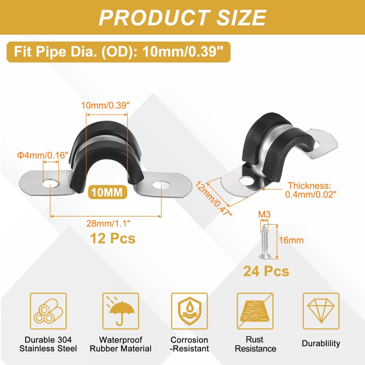 Material: 304 Stainless Steel, EPDM Rubber; Clamp Inner Width: 10mm/0.39"; Stainless Steel Clamp Width: 12mm/0.47"; Fit Pipe Dia. (OD): 10mm/0.39"; Thickness: 0.4mm/0.02"; Hole Dia.: 4mm/0.16"; Hole Spacing: 28mm/1.1"; Screws Size(DiaxL): M3x16mm; Package Contents: 12 Pcs x Cable Clamps, 24 Pcs x Screws. Durable Material: The cable clamp is crafted from 304 stainless steel and EPDM rubber cushioned pads for durability, it is oil-proof, waterproof, anti-oxidation, rust and corrosion-resistant, and the elastic rubber material provides effective buffering and insulation properties.. U-Tube Design: The U-Tube opening design facilitates easy attachment of pipe clamps to surfaces. The U-style curvature and rubber pad offer stable support for securing the pipe, safeguarding cables and pipes, minimizing wear, and extending the service life of the pipes.. Application: These cable clamps have a wide range of applications and are used in automotive, industrial, marine, home, construction, and other area. Commonly used for line management and maintenance. Suitable for stainless steel pipes, rubber hoses, plastic steel pipes, gas pipes, indoor and outdoor fixing of wires and cables..Other fine products