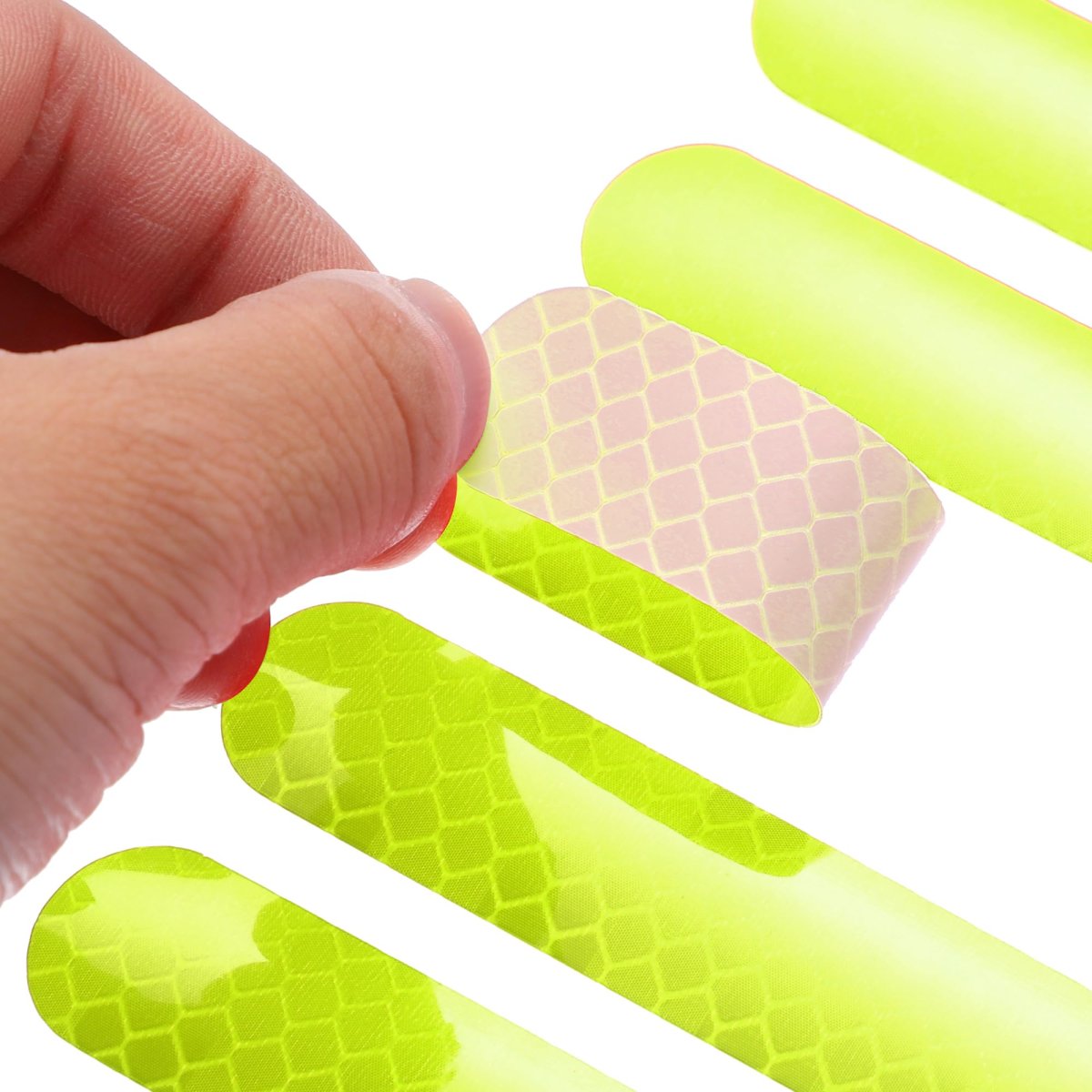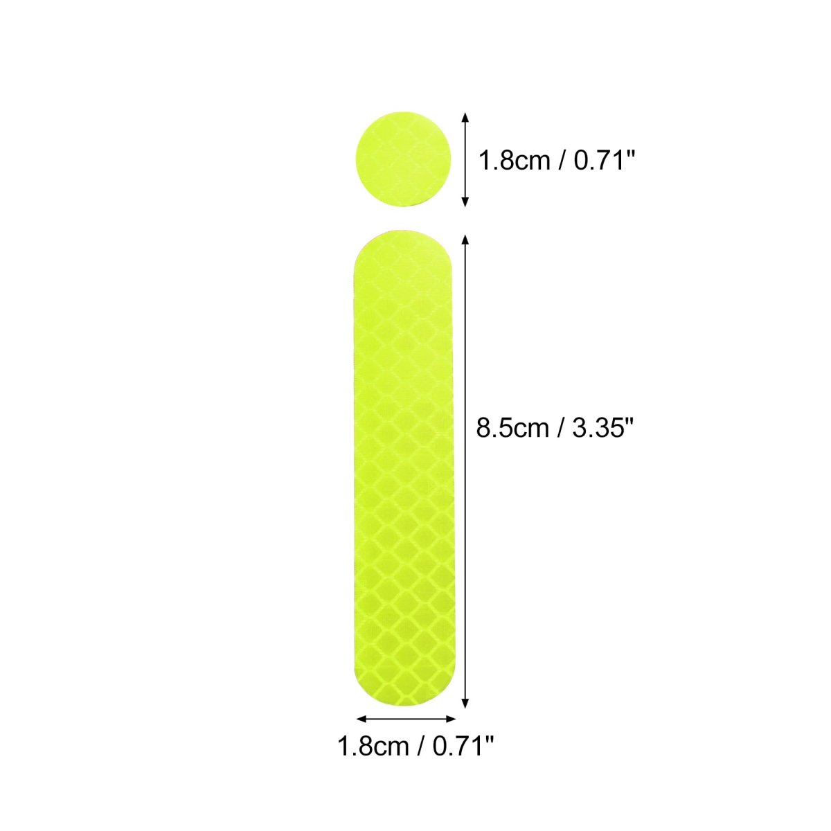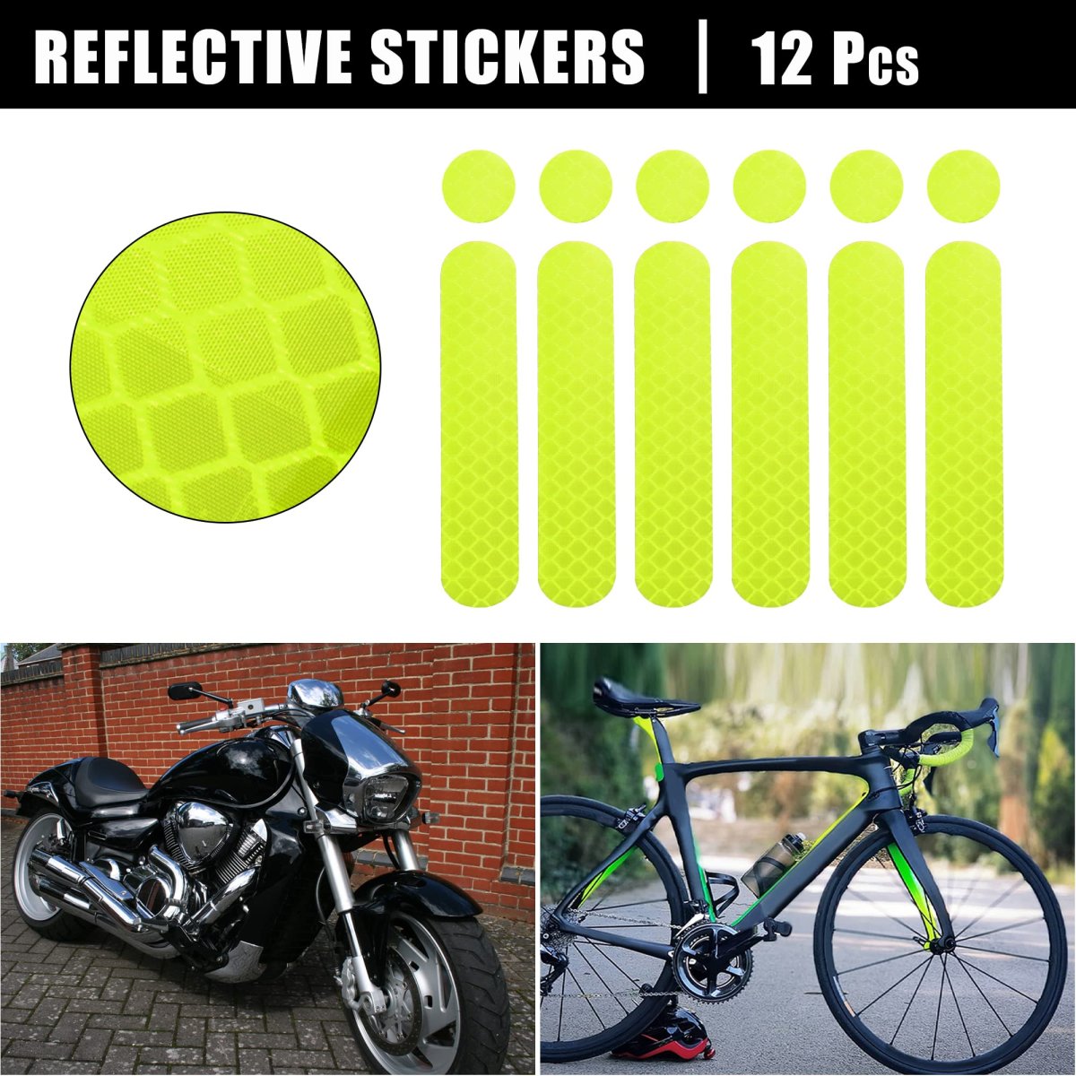Long Sticker Size: 8.5x1.8cm / 3.35"x0.71"(L*W), Round Sticker Size: 1.8cm / 0.71". The stickers can be pasted on cars, trucks, vehicle helmets, and motorcycles as needed.. Waterproof Sticker: These reflective films are made of PET material, and can be pasted on any surface for outdoor and indoor use.. Reflective: The sticker is honey comb pattern design, good visibility conspicuous colors with reflective sheets to ensure the reflective safety tape reflects light better in the dark.. Good Performance: The reflective good performance stickers ensure the necessary visibility in traffic during dark weather. Whether in rainy, foggy or snowy weather, the stickers reflect the car's light in all directions even in low light.. Package Included: 12 x Reflective Safety Decals.Other fine products