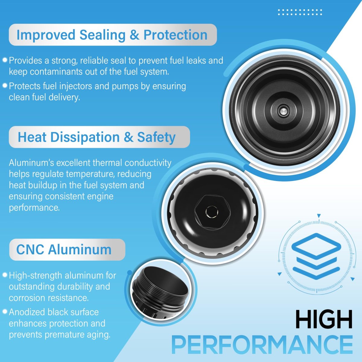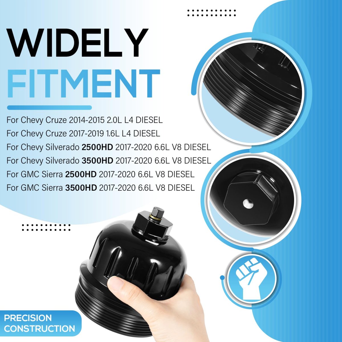 Strong Compatibility: For Chevy Cruze 2014-2015 2.0L L4 DIESEL, for Chevy Cruze 2017-2019 1.6L L4 DIESEL, for Chevy Silverado 2500HD 3500HD 2017-2020 6.6L V8 DIESEL, for GMC Sierra 2500HD 3500HD 2017-2020 6.6L V8 DIESEL.. What You Get: Directly replaces for part number 134001, includes Fuel Filter Housing, Drain Plug with Washer and Installation Instruction. (NOTE: without TP1015 fuel filter.). Improved Sealing & Protection: Fuel filter housing cap provides a strong, reliable seal to prevent fuel leaks and keep contaminants out of the fuel system. Protects fuel injectors and pumps by ensuring clean fuel delivery.. Heat Dissipation & Safety: Aluminums excellent thermal conductivity helps regulate temperature, reducing heat buildup in the fuel system and ensuring consistent engine performance.. Premium CNC Aluminum: Made from high-strength aluminum for outstanding durability and corrosion resistance. Anodized black surface enhances protection and prevents premature aging..Other fine products