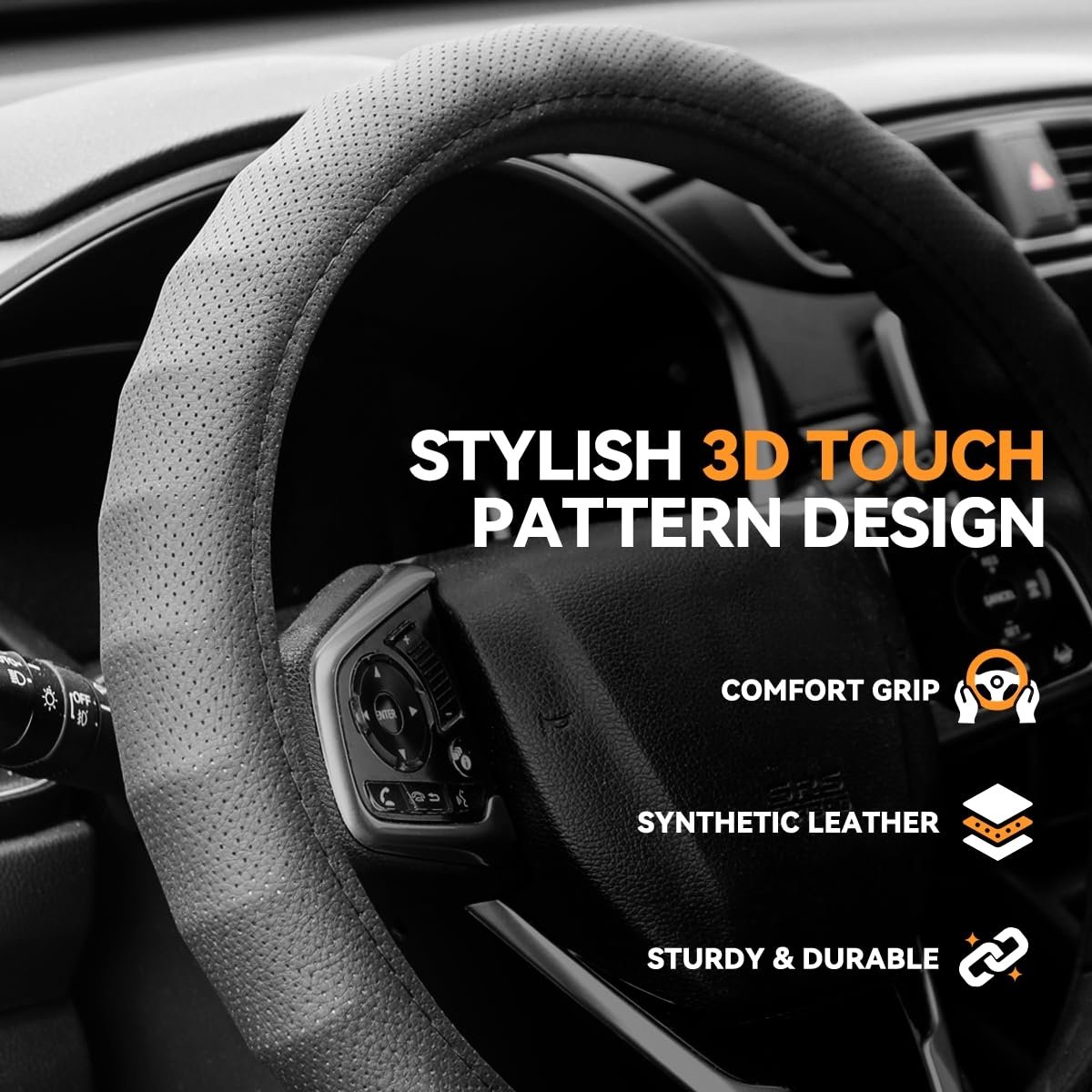 Eco-Friendly Material - Elevate your driving experience with our premium steering wheel cover, crafted from high-quality eco-friendly synthetic microfiber leather. This durable and luxurious material not only enhances the look of your vehicle's interior but also provides lasting protection against wear and tear.. Anti-Slip Inner & Comfort Grip Design - Our steering wheel cover features an inner rubber lining that ensures a secure and comfortable grip, reducing the risk of slippage and hand fatigue during long drives. This thoughtful design improves your control and comfort on the road.. Universal Compatibility - Designed with versatility in mind, this cover offers a universal fit for mid-size steering wheels measuring between 14.5 to 15 inches in diameter (37cm to 38cm), making it suitable for a wide range of vehicles.. Easy Installation - Simplify your upgrade process with our effortless and quick installation design. No complex tools or instructions required just slip it on and enjoy the immediate upgrade to your vehicle's cockpit.. 3D Touch Pattern Design - Stand out on the road with 3D Touch Pattern Design that not only adds an elegant touch to your steering wheel but also ensures a fashionable and modern look for your car's interior..Other fine products