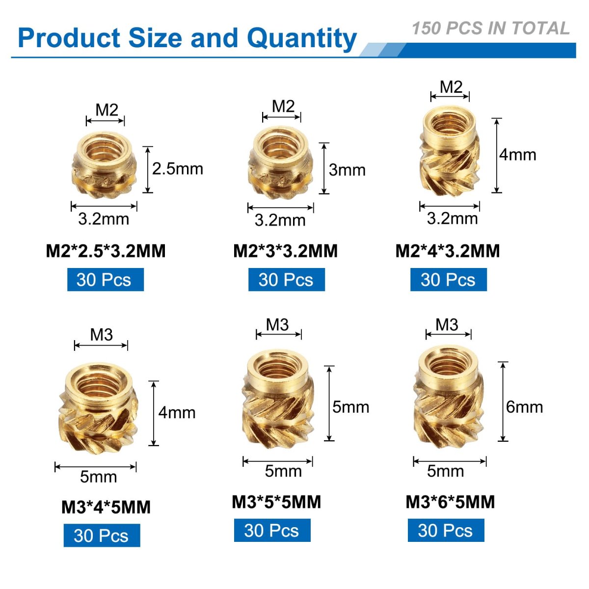 - 150pcs M2 M3 Metric Threaded Inserts Brass Heat Set Insert Knurled Nuts Assortment Kit 3d Printing Female