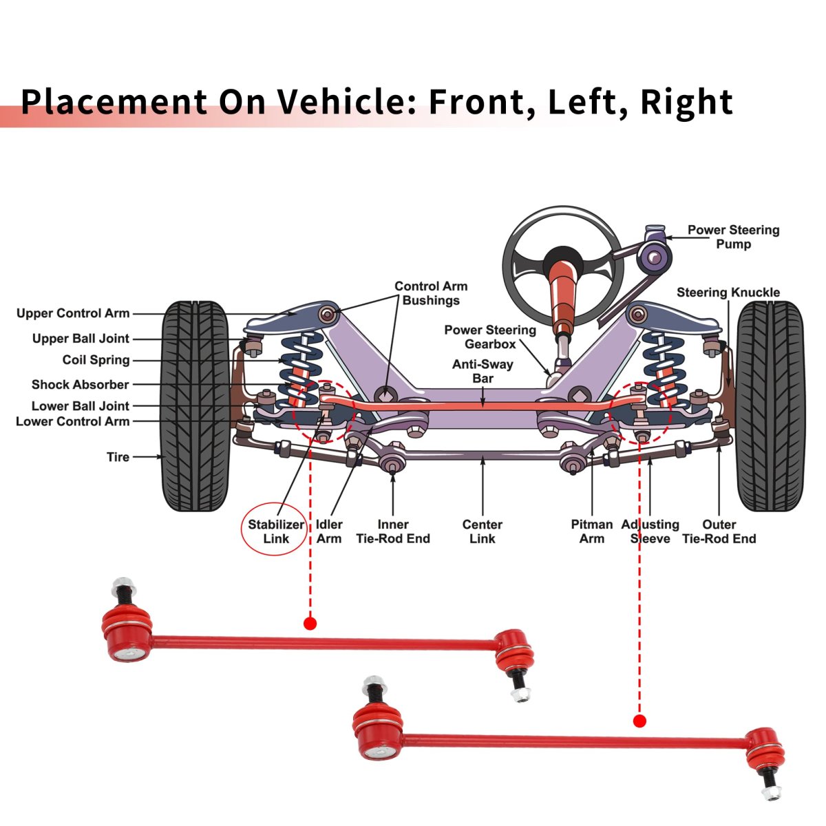 FITMENT: Sway Bar Link fit for Honda Civic 2016-2017, for Honda Civic 2018-2019 1.5L, for Honda Insight 2019. OE Number:K750865; [PLACEMENT ON VEHICLE]: Front, Left, Right; [PACKAGE INCLUDES]: 15 x Front Sway Bar End Links. FUNCTION: This sway bar link can fix the clunking noise when going over small bumps, prevent excessive leaning during turns and improve the car's stability. And the ball ends provide smooth operation throughout the entire range of driving.. WHEN TO REPLACE: Signs your suspension system needs replacement include clunking noises during turns and bumps, loose or misaligned steering wheel, poor handling, uneven tire wear, and visible damage in the suspension system.. INSTALLATION: Manual is not included, first, remove the upper and lower bolt, then disconnect the stabilizer end links from the sway bar and the control arm. At last, install the new and suitable suspension stabilizer links..Other fine products