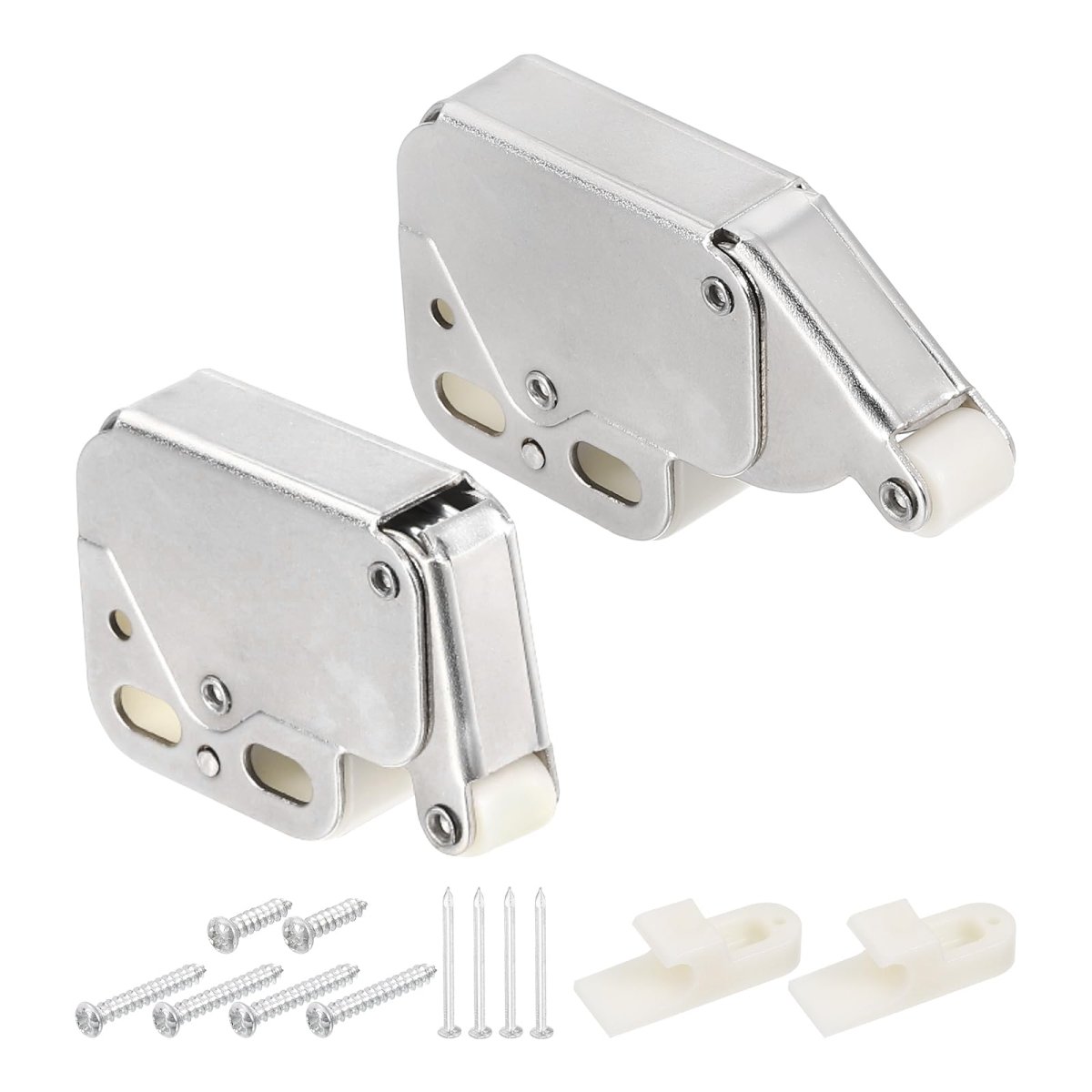 What you get: You will get 2 Pcs of Magnetic Push Latch, which made of Metal and color is Grey. The Latch width is 28 mm / 1.1 inch, height is 49 mm / 1.93 inch.. Material: Made of a Good-Quality base and durable spring mechanism ensures anti-rust and corrosion resistance. Our push opener is built to last. With enough tension and 15 lbs of strength, it can withstand up to 20,000 uses. The good-quality ABS shell is anti-rust and corrosion-resistant, ensuring that it will last for years to come.. Design: Our built-in snap hook ensures that your doors stay securely closed. No need to worry about the door not closing properly. Our system provides a tighter seal than magnetic push-to-open or magnet catch systems.. Easy to Use: Our push latch is easy to install with two long circular installation holes that allow for easy positioning and alignment. The small plate can be easily connected to keep your cabinet closed. Our push latches come with good-quality mounting screws, so you don't need to worry about buying them separately.. Effortless Opening: No more handles or knobs! Our push-to-open system allows for quick and easy access to your cabinets, drawers, cupboards, wardrobes, and dressers for medium-sized doors. Enjoy a clean and seamless look with no visible hardware..Other fine products
