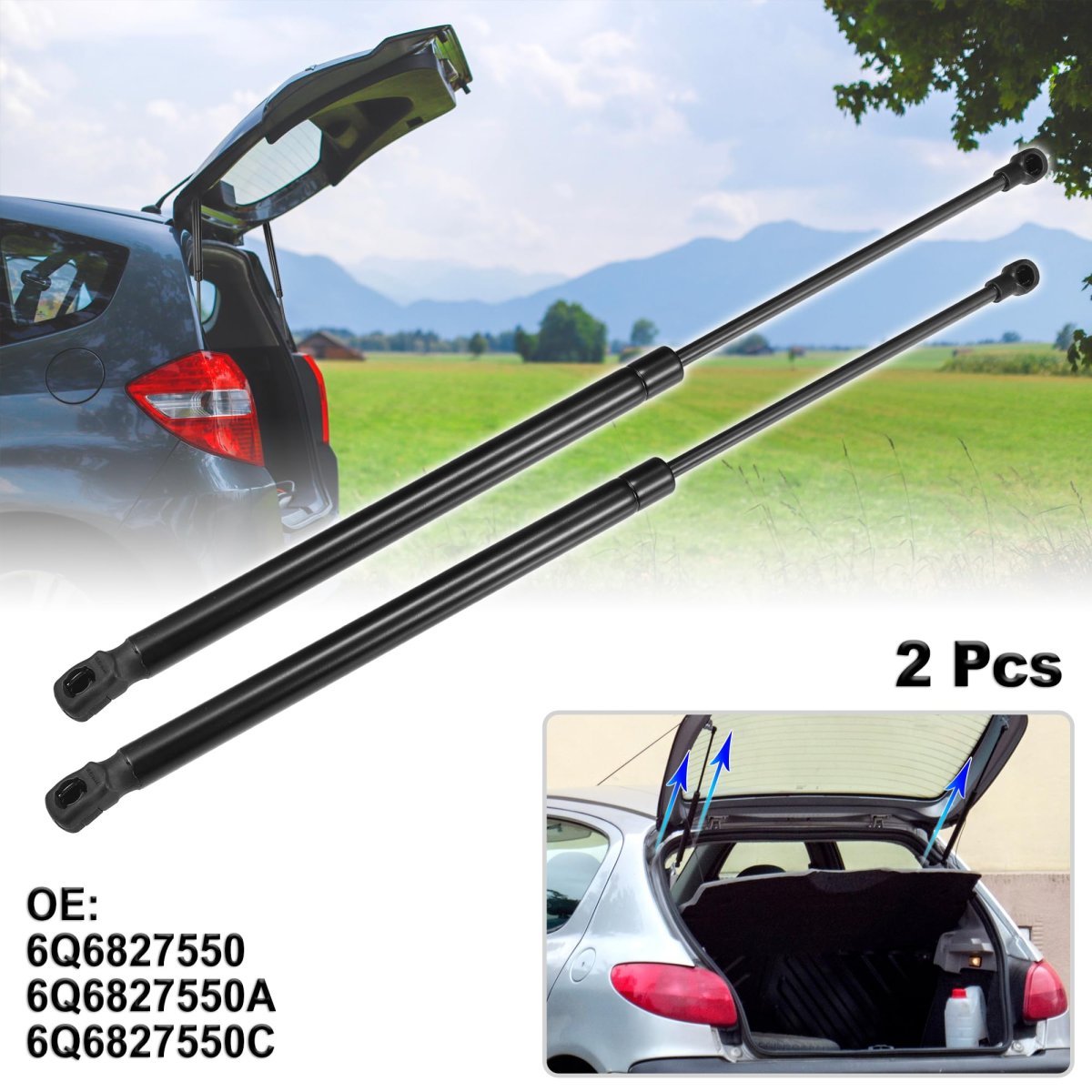 OE Numbers:6Q6827550/6Q6827550A/6Q6827550C; Fit for VW Polo 9N_ 2001/10-2009/11 Hatchback. Features: Gas Springs are printed a waterproof material on the surface, dustproof, easy to clean.. Lift Support Strut is made of durable carbon steel material, strong and durable to support Rear Hatch.. Easy to install, measure distance for install, fix mounting brackets, and then press on the new gas spring on the installation position.. Package included: 2 Pcs Lift Supports Struts.Other fine products