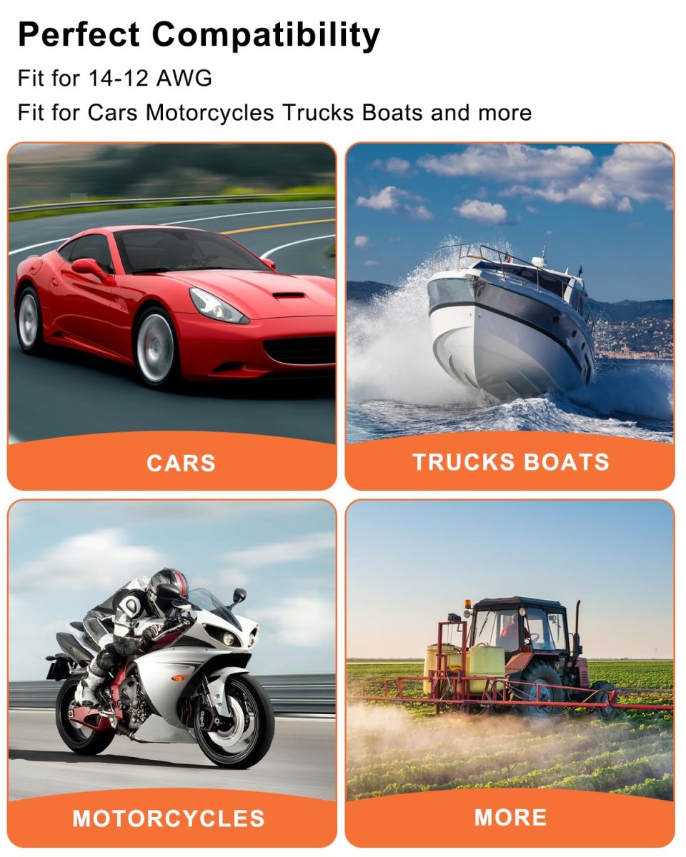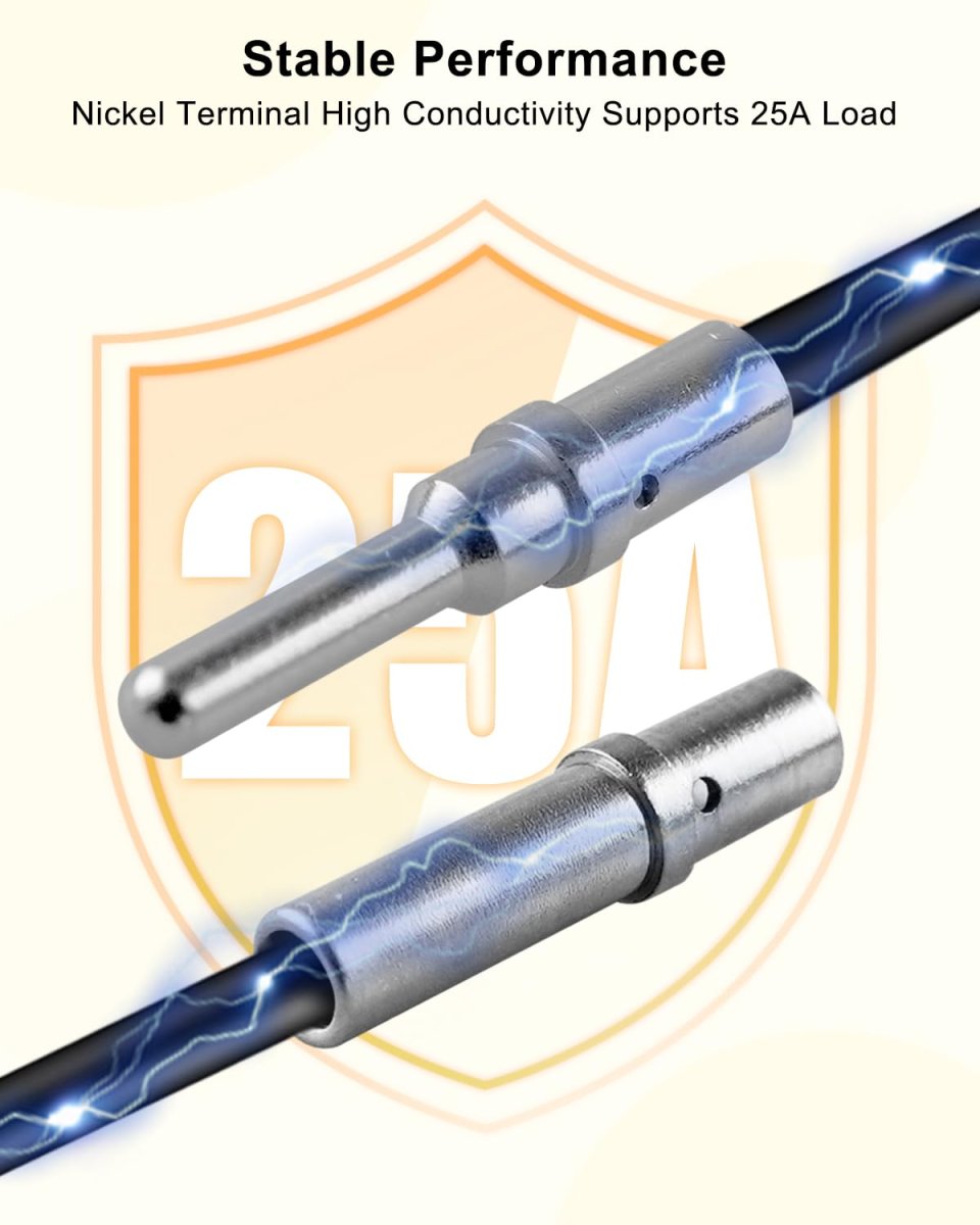 High Conductivity: Nickel-plated solid contacts, each with a continuous capacity of 25A, ensure strong conductivity and stability. Particularly suitable for applications with a wire range of 14-12AWG, ensuring safe and reliable electrical connections. Excellent Waterproof Performance: Meets IP67 waterproof standards, and connectors equipped with rubber seals effectively prevent moisture and dust intrusion, ensuring safe operation of circuits even in harsh environments. High Safety: Self-locking anti-disconnection structure design, using wedge locks to avoid the risk of accidental disconnection under bumpy road conditions or vibration environments, ensuring electrical safety in outdoor environments, and enhancing safety of use. Wide Compatibility: Fit for a wide range of vehicles and equipment, including automobiles, motorcycles, trucks, ships, construction, agriculture, mining and other industries. Its design ensures stable electrical connection in a variety of application scenarios. Products Include: You can get 2 plug 2-pin connectors, 4 pairs of 20-gauge terminals (4 pins/4 sockets) to meet your installation needs, quickly restore equipment performance, and reduce downtime.