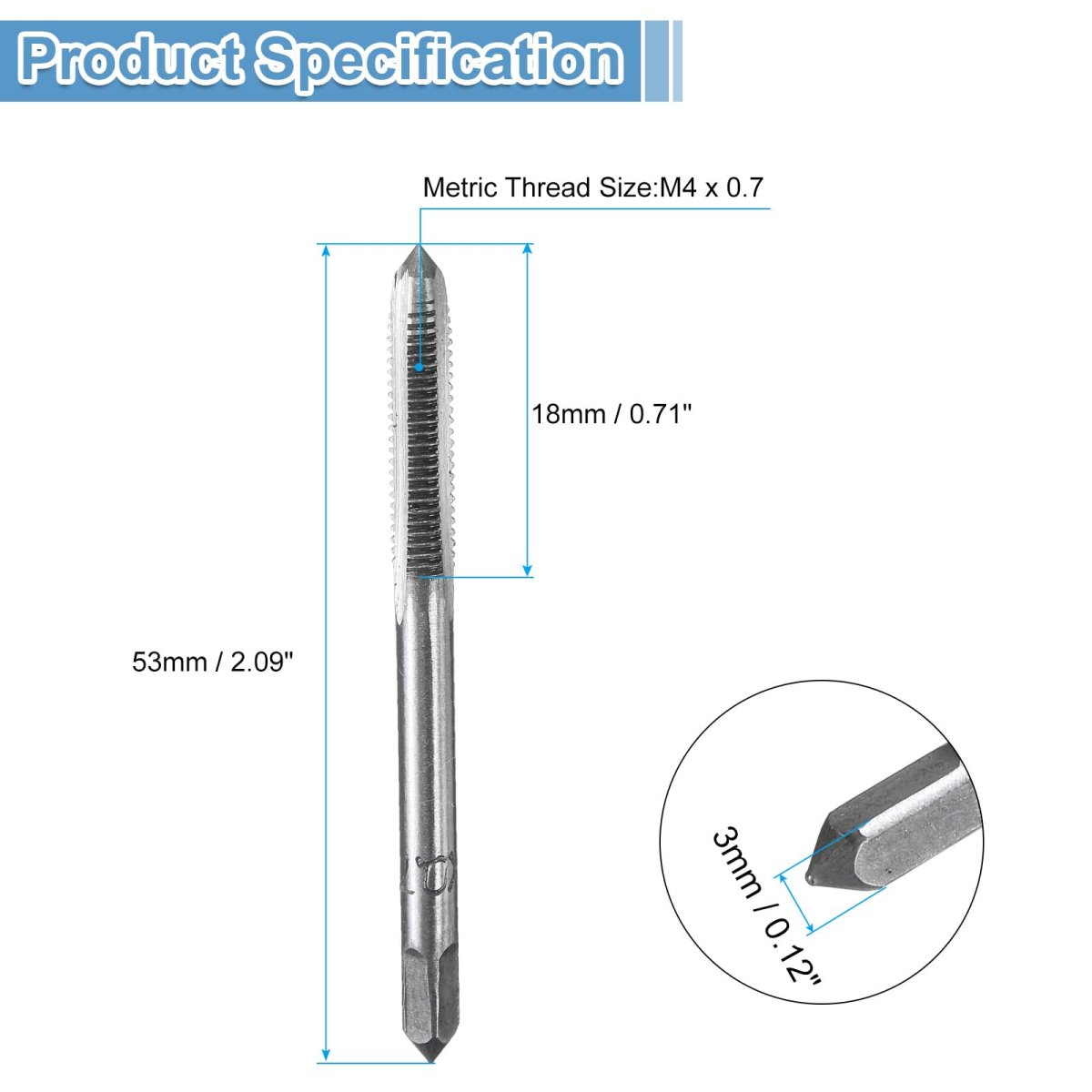 20 Pairs Hand Tap Set Size: Metric thread size: M4 x 0.7; thread length: 18mm / 0.71"; total length: 53mm / 2.09"; square end width: 3mm / 0.12"; accuracy class: H2. Right hand thread cutting, clear threads, fast tapping with accuracy.. 2 Styles of Taps: Taper Tap: Start the thread and guide it into the workpiece; Bottoming Tap: Generate threads close to the bottom of a hole. The tools are precision machined to produce accurate threads, ensuring a tight and secure fit when used to tap holes.. Wide Applications: Hand taps are mainly used with tap wrenches and are suitable for re-tapping damaged or stuck threads, or to create new threads. Used for tapping through or shallow holes in mild steels, aluminum, iron, copper, hard plastic. Straight groove design can quickly remove chips downward, reduce operating resistance, and achieve efficient processing.. Durable & Reliable: 6542 (M2) high speed steel tap set offers high hardness and excellent wear resistance for durability and longevity, and good cutting performance for clean, precise holes. Designed with basic structure without any coating, suitable for a wide range of applications.. Tips: Tapping oil has lubrication, cooling, and anti-sticking effects. Adding appropriate tapping oil can obtain higher-quality internal threads and more durable taps. Ensure proper alignment, use proper tapping technique, and apply consistent pressure as you turn the tap to achieve clean, precise threads..Other fine products