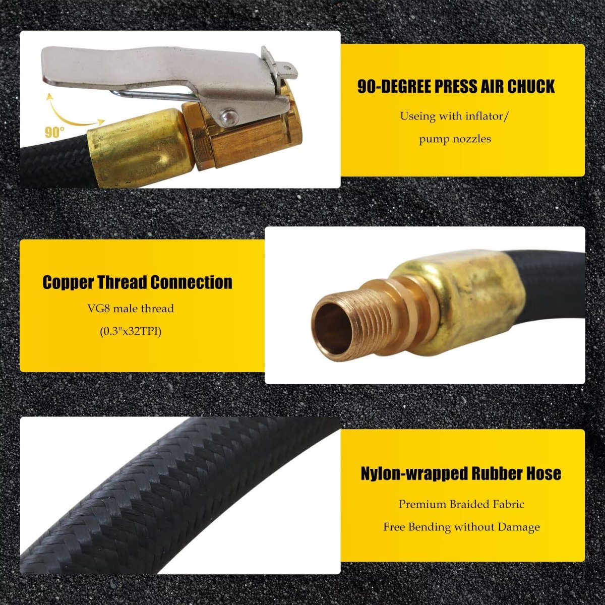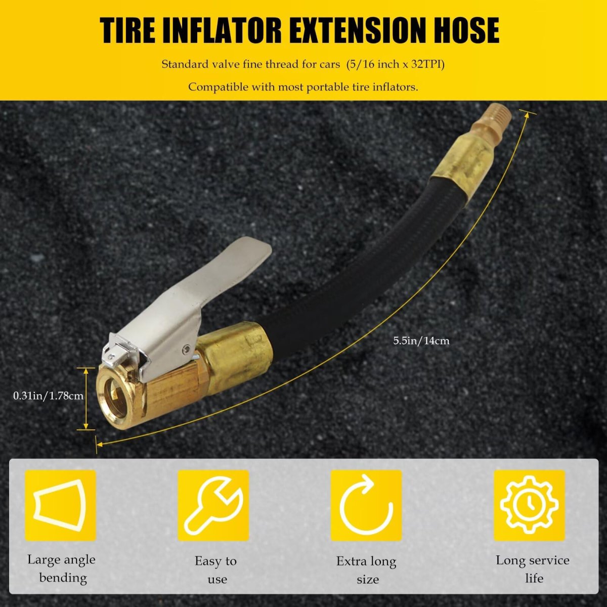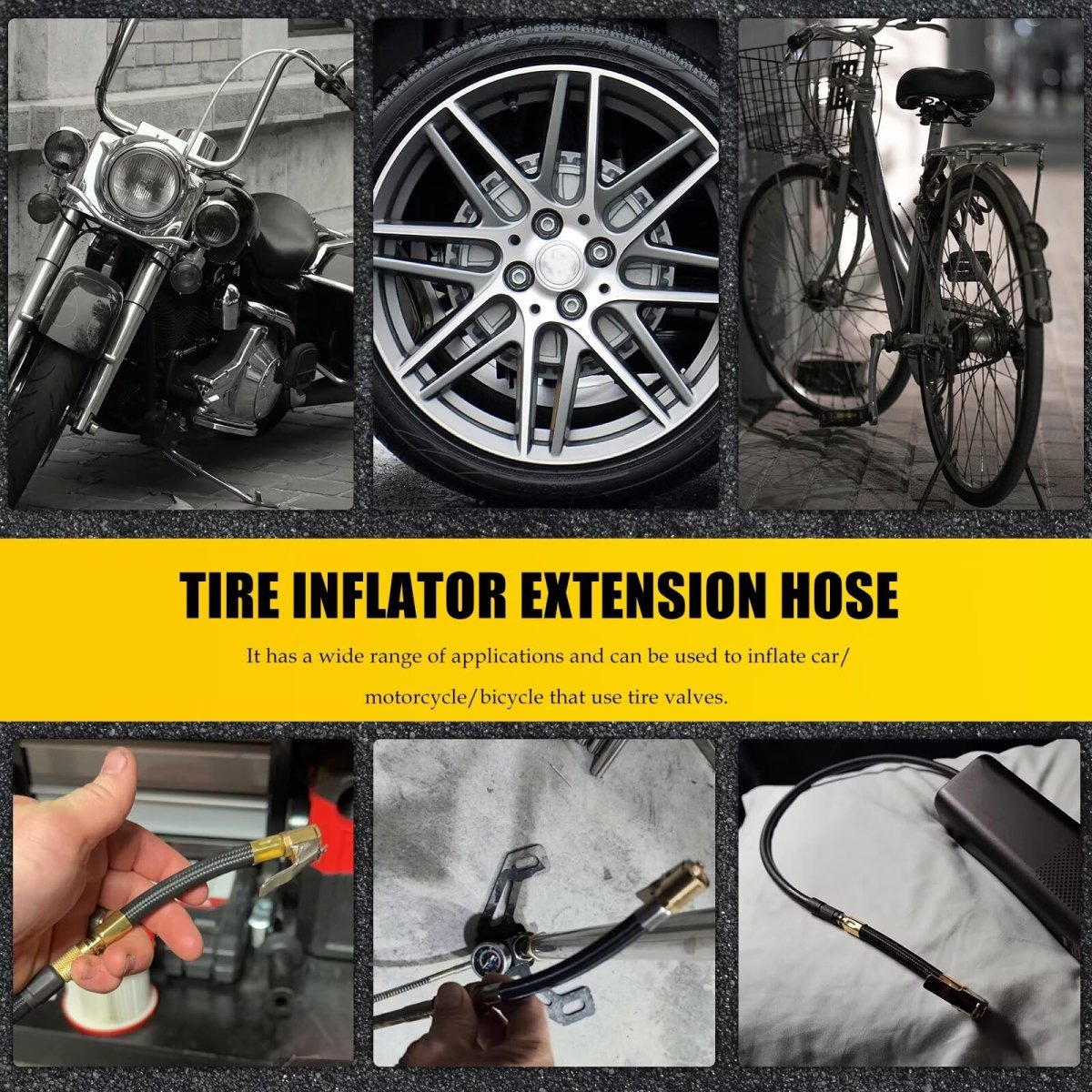 Item Type14cm/5.5" Tire Inflator Extension Tube Tyre Pump Quick Inflation Chuck Adapter Hose Quick-Inflation Clip Connector High-Pressure Tube Car Motorcycle Maintenance Accessories. MaterialIn the middle of the inflator hose is an inflatable tube made of high-pressure resistant woven cloth, with a pressure resistance of up to 300PSI. There is brass portable tire inflator chuck adapters, which are not easy to rust and wear. FeatureThis tire inflator extension hose can help the chuck to quickly connect and disconnect the tire nozzle to ensure that the air pressure in the tire will not lea-k when the tire is inflated and disconnected. Conducive to maintaining proper tire pressure, making driving more stable and safer. Easy to Use & Portable DesignThe sealed air sucker ensures that there is no annoying air leakage, and the high-quality reinforced rubber hose is strong and stable. It has a wide range of applications and can be used to inflate car/motorcycle/bicycle that use American tire valves.Other fine products