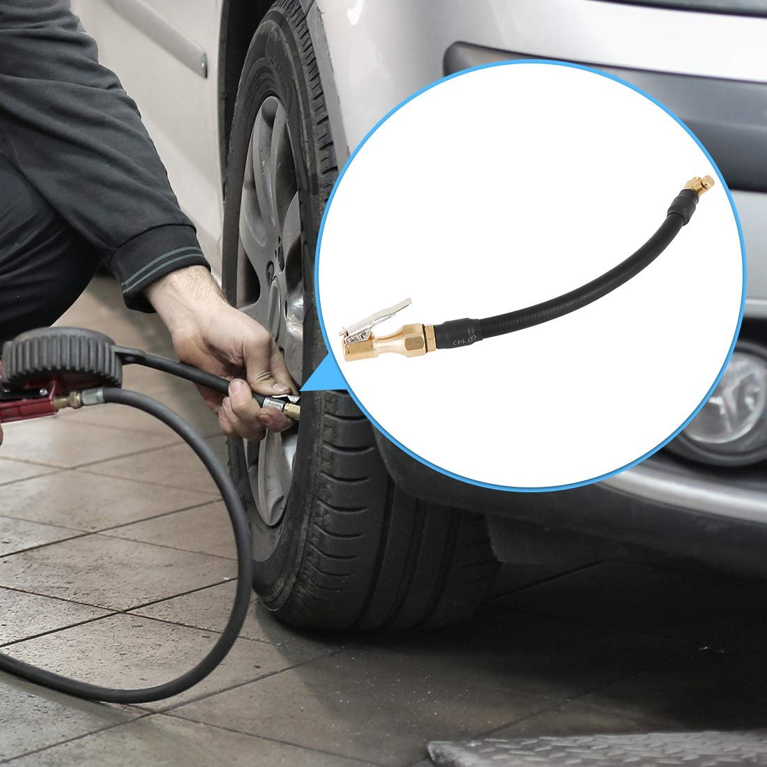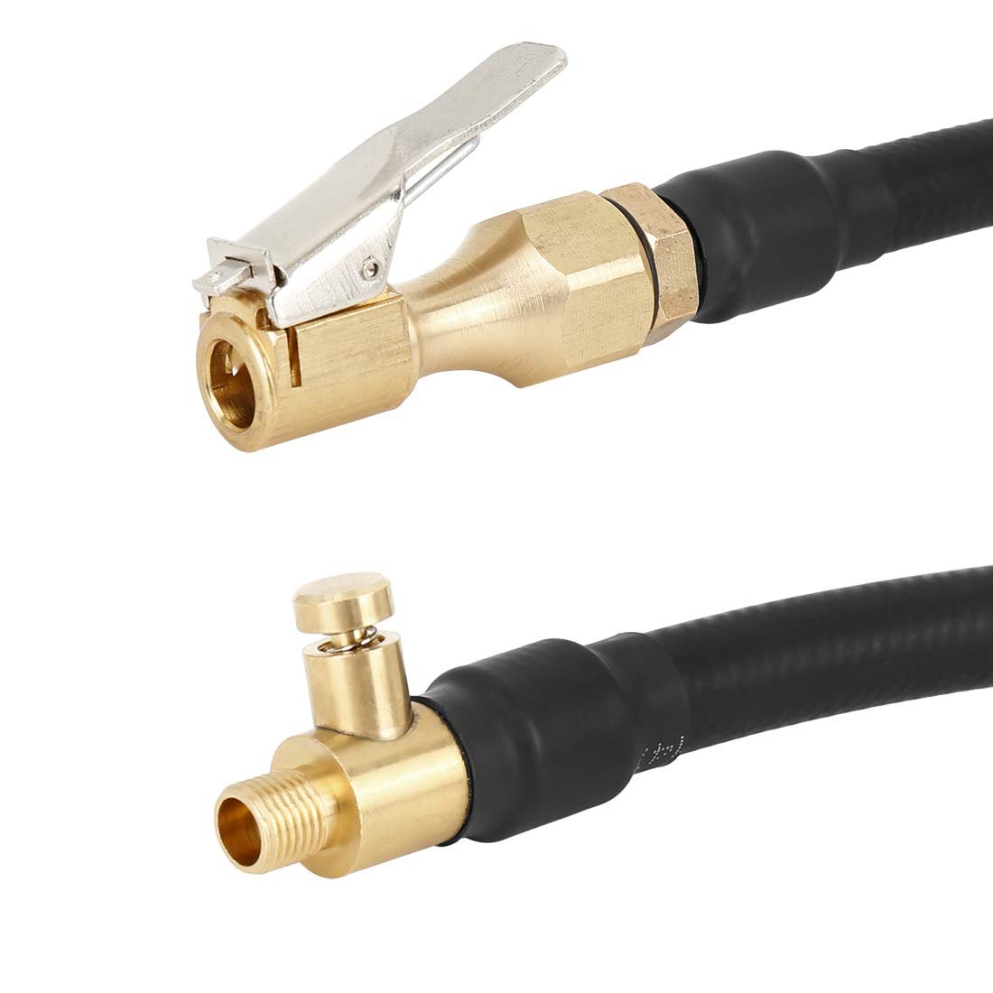 Designed for tire inflator hose converting, easily convert your inflator from a connection to a press-on connection.. Screw adapter end onto original inflator hose, press to clamp adapter head onto tire valve, start the inflator for a quickly and none leaking inflation. Another function, can vent air for the tire.. Excellent tight seal lock-on tire chuck, anti-corrosion, wear resistance, good performance and high stability. strengthen hose, durable and flexible.. Tire inflator chuck adapter can connect to your tire quickly for a speedy inflation, suitable for bike, motorcycle, car air fill.. Make sure this is the correct application type of Air Inflator Hose Adapter before placing order..Other fine products