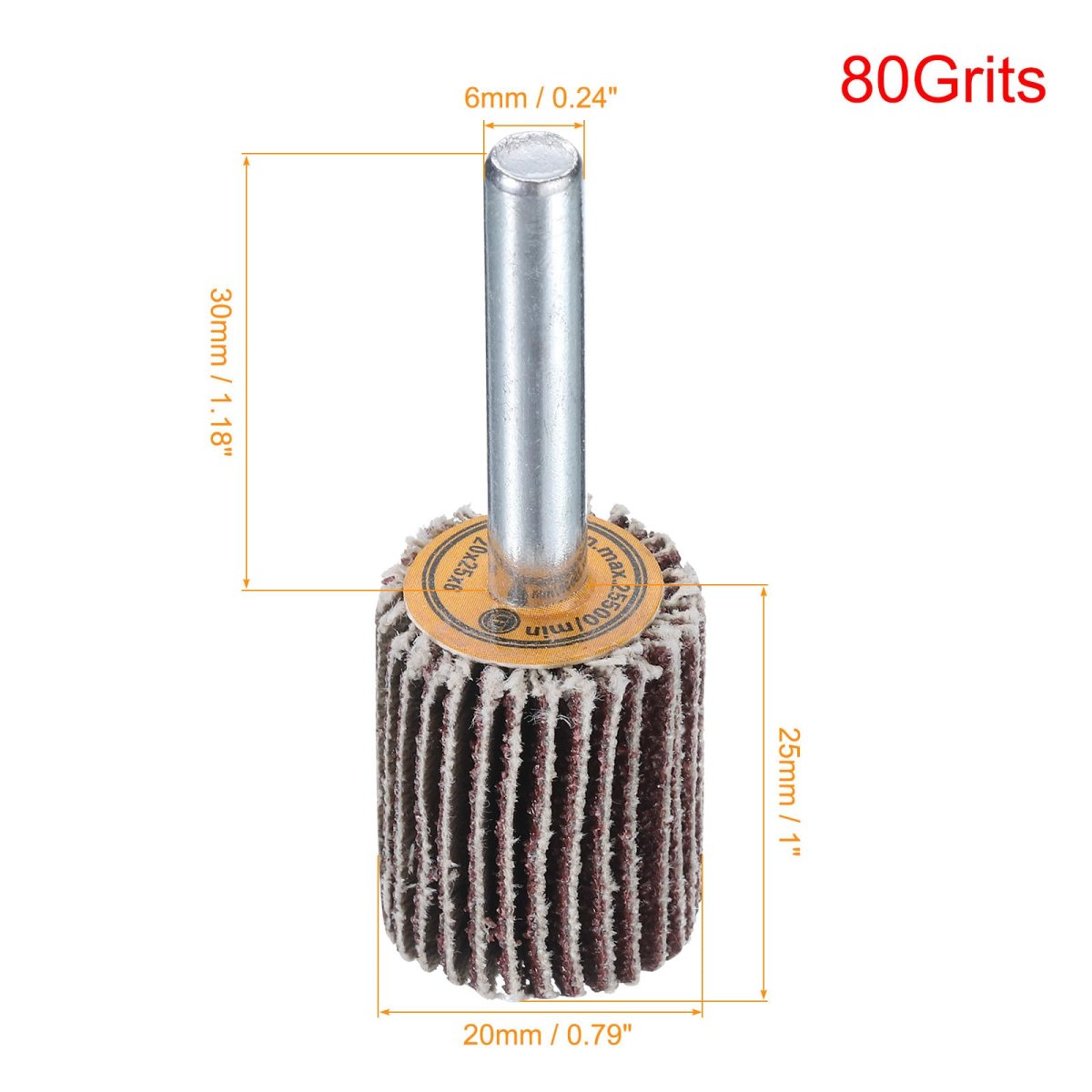 80 Grits; 25000R.P.M; 0.79inch diameter, 1inch length with 1.18inch shaft.. With advanced grinding technology, the flap wheel has good elasticity and high grinding efficiency.. Thickened design of the flap wheel, good heat dissipation and low noise, suitable for long-term use.. Suitable for grinding, deburring, edge blending, chamfering and finishing on a wide range of material.. Can be used with pneumatic tools, electric drills, bench drills, pneumatic drills, etc..Other fine products