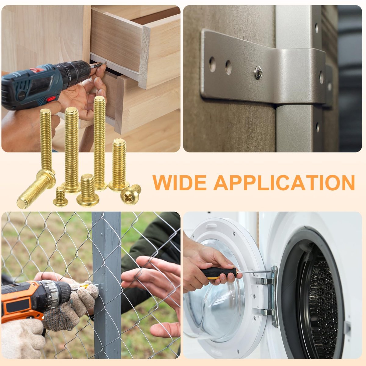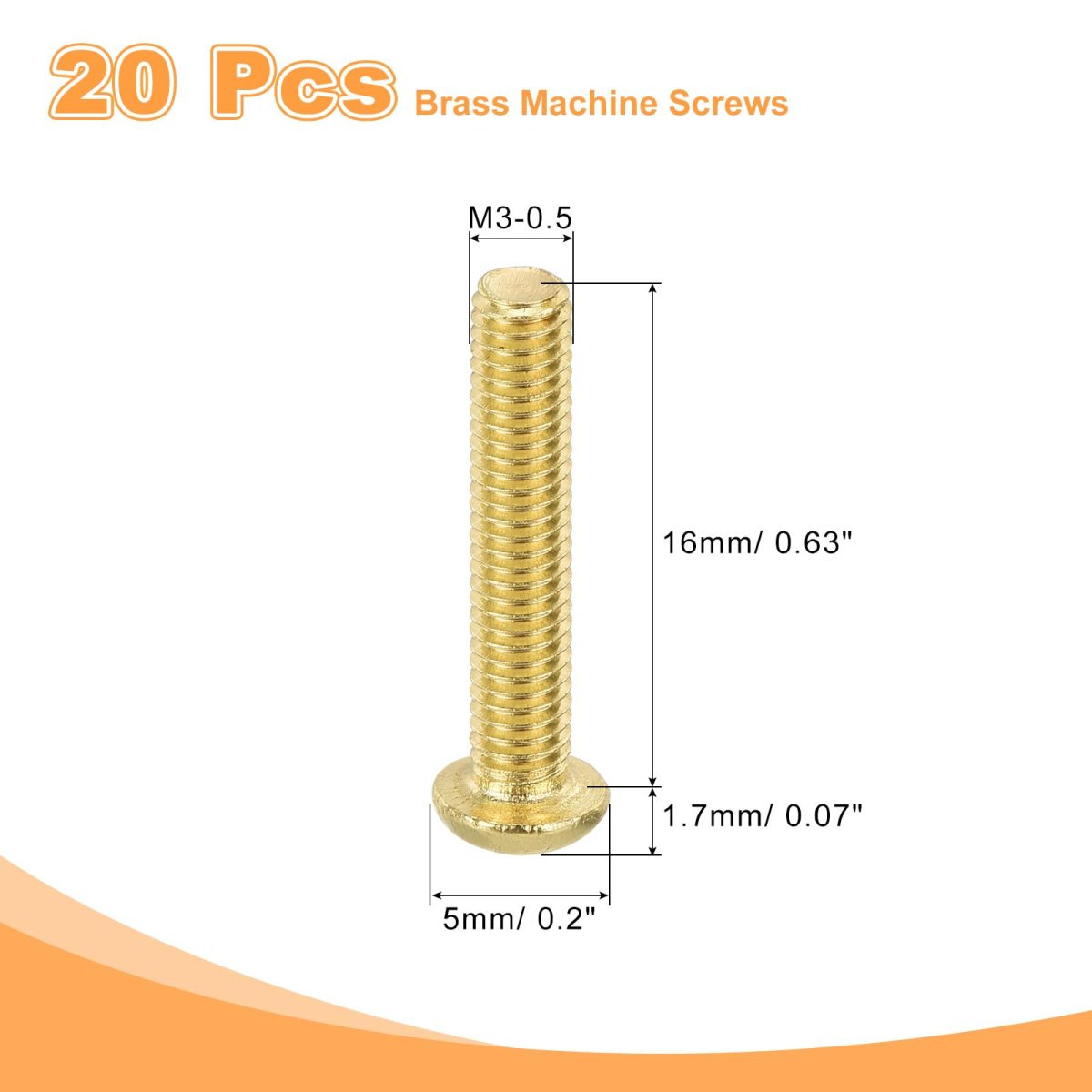 [SIZE&PACKAGE]: Machine Screws Size: Pitch: 0.5mm/ 0.02inch; Screw Diameter: M3(3mm/ 0.12inch); Screw Length: 16mm/ 0.63inch; Head Diameter: 5mm/ 0.2inch; Head Thickness: 1.7mm/ 0.07inchPackage Content: 20Pcs x Brass Machine Screws. [MATERIAL]: Made of brass material, these Phillips machine screws not only have better corrosion resistance, rust resistance, and long-lasting service than the ones made of steel but also have a good fastening effect. [DESIGN]: These screws are designed with a pan head with a cross notch, which allows the screws to be easily tightened or loosened with a cross screwdriver during installation, providing installation convenience and a large bearing surface, preventing damage to the machinery and ensuring a firm fixation in various projects. [INSTALLATION]: Our brass cross slot screws have a smooth surface, allowing you to install during use easily, you only need to tighten with a screwdriver, and it is not easy to slip during installation. [APPLICATIONS]: These pan head screws are suitable for use as fixing components, industrial and construction fasteners. Widely used in home furniture, office appliances, communication equipment, ship assembly, and other machinery industries.Other fine products