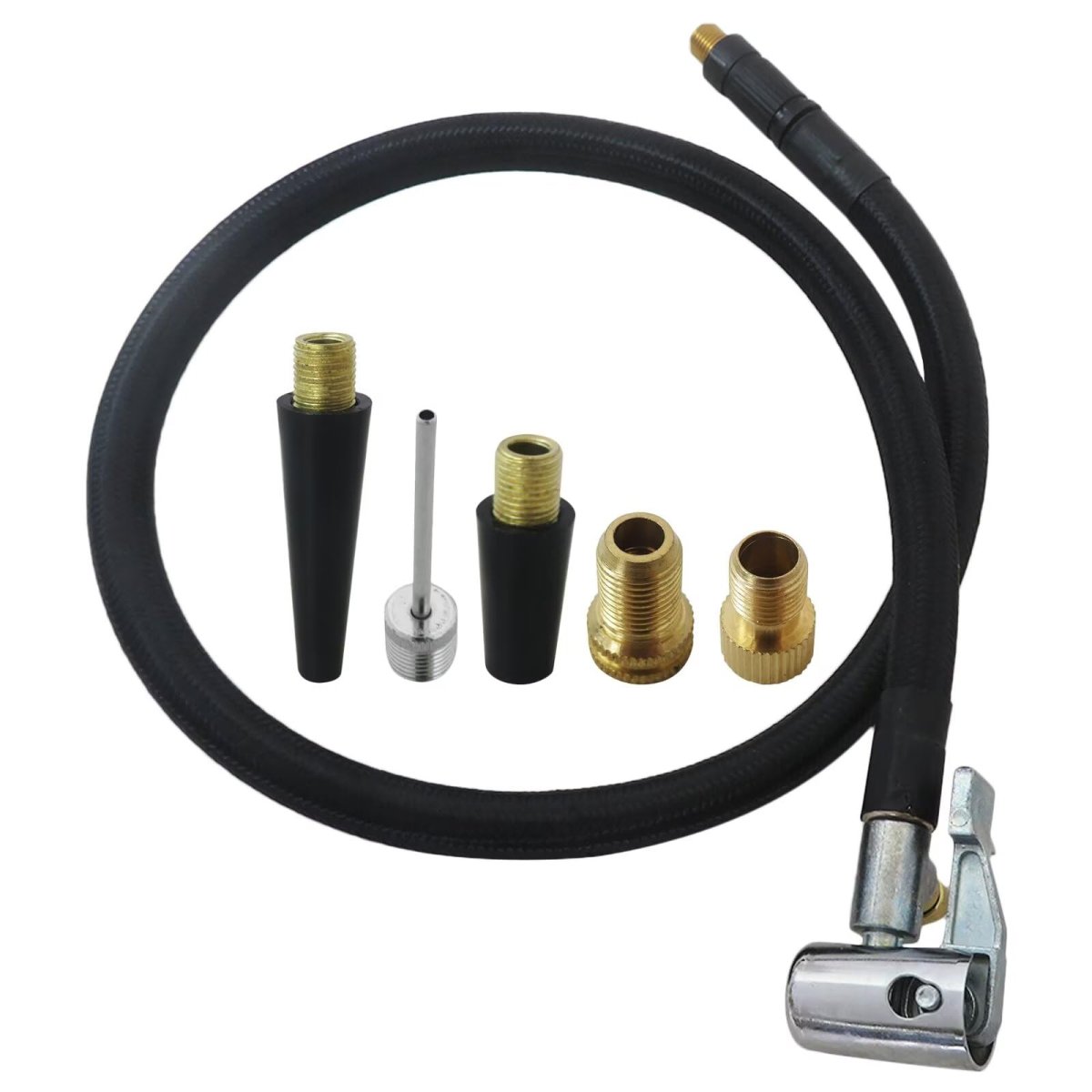 ItemNew 21'' Quick Air Release Extention Hose, Tire Valve Extension Tube w/ Valve & Air Pump Ball Needle Set, Air Tire Inflator Pump Hose with Air Chuck Adapter for Portable Air Compressor. UNIVERSAL CONNECTION THREADStandard schrader valve fine thread for cars (8V1 thread, 0.305"x32TPI) for most portable tire inflators. A schrader to presta valve adapter for bike, motorcycle, car air fill. Also comes with universal needle inflator tools, making them useful attachments for compressors, electric air pumps, also ideal for inflatable toys, sports balls, balloon, swim ring,etc. 21 Inch Lengthened & Flexible21'' extended tire inflator/pump hose adapter with strengthen nylon-wrapped rubber hose, covers more distance and provides more flexible space for much easier access to the tires or connect to those space constrained valves. Locking Tightly & No Air Leakinglocking tightly onto valve stems in the process of air inflation. Excellent airtight seal make sure no annoying air leaking, brings you quick hands-free inflation. Package Included1x 21''/55cm Quick Air Release Hose, 1x Presta Valve Adaptor(American type to French type), 1x Ball Needle Adaptor, 2x Tapered Nozzles. Your essential tire inflation tool in emergency and daily use for quick hands-free inflation. Just buy with confidence, we always stand behind all of our items.Other fine products