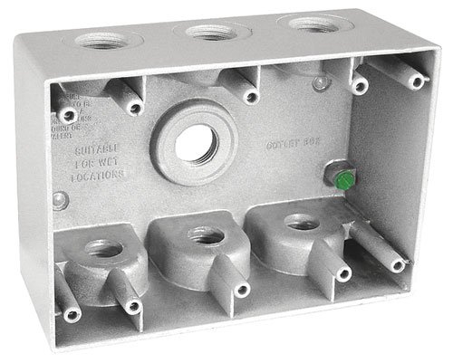 2-5/8 Inch deep three gang weatherproof boxes with (7) 1/2 Inch holes are used for branch circuit wiring in wet, damp and dry locations. They may even be used as weatherproof junction boxes to install receptacles, switches and GFCIs. Garvin Industries three gang weatherproof boxes have reinforced connector outlets and come with an innovative powder coat finish that promotes maximum durability, weather protection and scratch resistance. They come standard with detachable lugs, four closure plugs and ground screws already installed making installation fast and effortless. Garvin Industries three gang boxes have internal threads on their hubs that comply with NEMA requirements and accept all threaded fittings and conduits.Other fine products