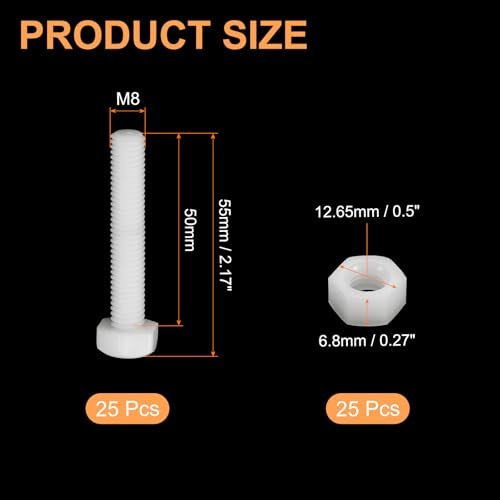 [WHAT YOU GET] - Package comes with 25 pieces of hex head screws bolts and hex nuts. Thread Size: M8 x 50mm, Bolt Size: 55 x 12.8mm/2.17 x 0.5inch(L*W), Nut Size:12.65 x 6.8mm/0.5 x 0.27inch(L*W). Sufficient quantity to meet your daily needs and replacement. [MATERIAL] - The screws and nuts are made of nylon and are small in size. These components are light but strong, with good insulation, corrosion resistance, rust resistance and durability.. [DESIGN] - The nylon screw sets are a fastening component with a hexagonal head design, which has a good fastening effect. The clear and compact thread makes it not easy to get out of shape and slide in the rolling process. Due to the special material of nylon, it will not interfere with the signal of electronic equipment, also suitable for places that require non-conductivity. [EASY TO INSTALL] - The installation of the nylon screws and bolts is very simple and quick, and it only takes a few minutes to complete. You can use a standard wrench or a socket wrench for installation. Both professionals and DIY enthusiasts can effectively fix the components with minimal effort. [WIDE APPLICATION] - The screw nut kits are widely used in various industries such as electronics, wind power, office equipment, communications, shipbuilding, exhibitions, aerospace, and other mechanical industries. They are also suitable for DIY projects and crafts.Other fine products