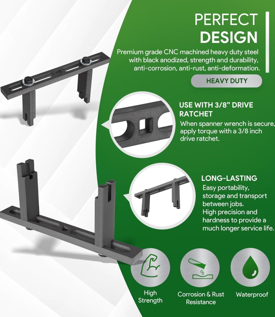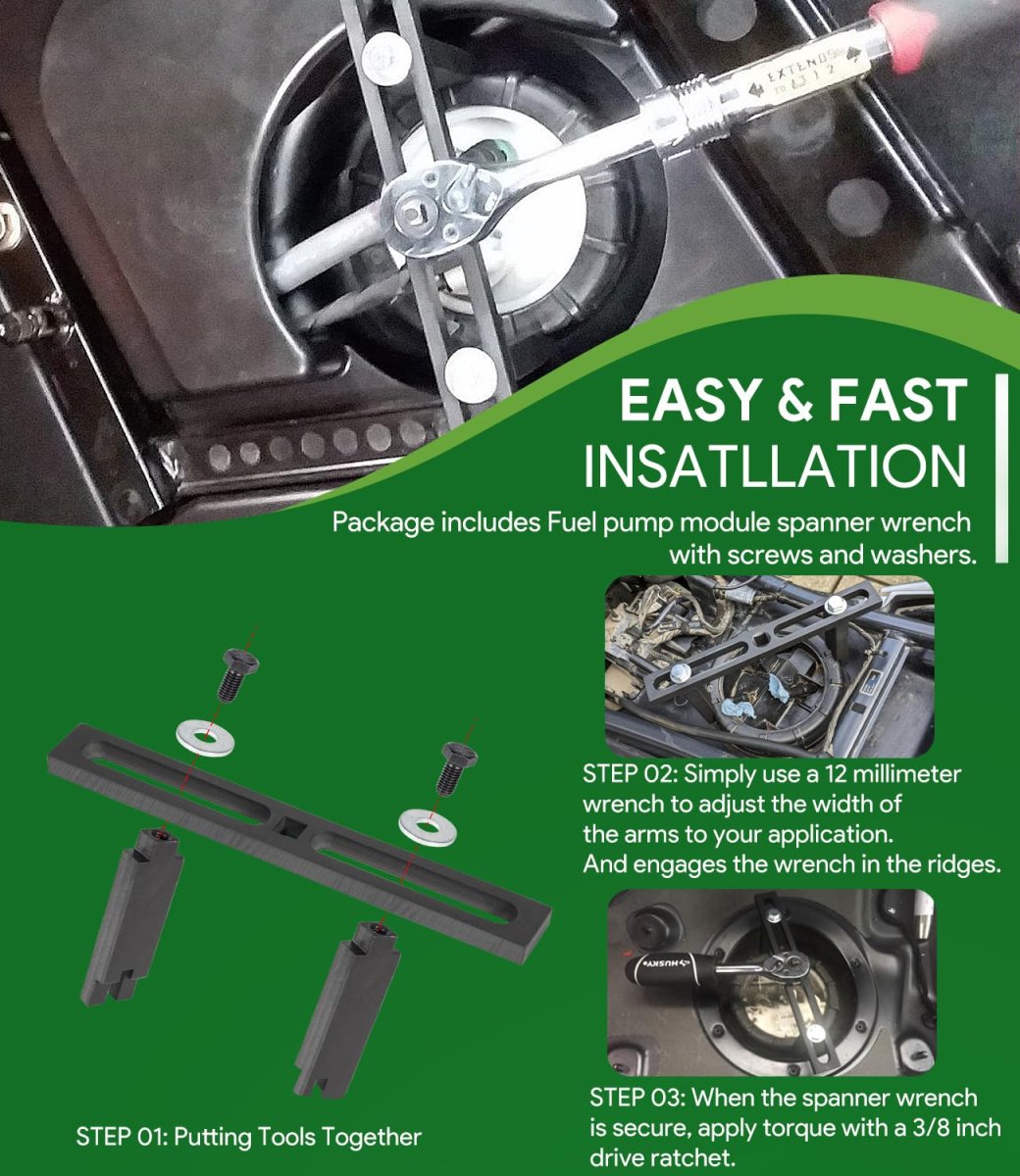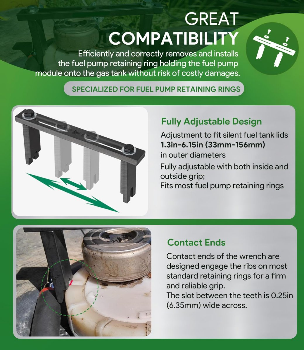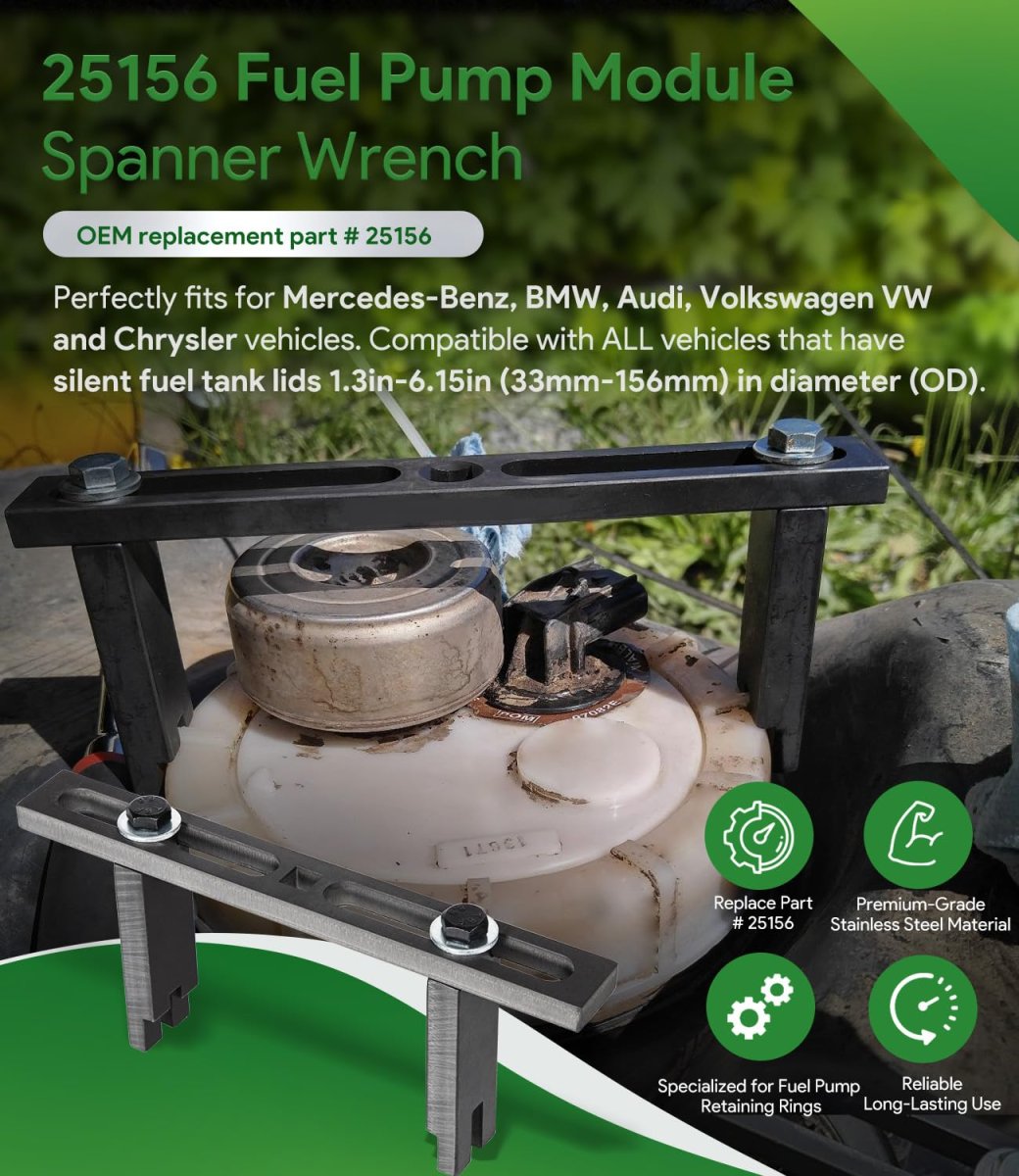 Great Compatibility 25156 Fuel Pump Module Spanner Wrench is compatible with all vehicles that have silent fuel tank lids 1.3-6.15in (33mm-156mm) in outer diameter. Fits for Mercedes-Benz, BMW, Audi, Volkswagen VW and Chrysler vehicles.. Specialized for Fuel Pump Retaining Rings Efficiently and correctly removes and installs the fuel pump retaining ring holding the fuel pump module onto the gas tank without risk of costly damages. Specialty adjustable spanner is fully adjustable for inside and outside grip. Contact ends of the wrench are designed engage the ribs on most standard retaining rings for a firm and reliable grip.. Easy & Fast to Use Package includes Qty-1 Fuel pump module spanner wrench with screws and washers. Simply use a 12 millimeter wrench to adjust the width of the arms to your application. The wrench easily engages in the ridges around a threaded locking collar that secures the fuel pump to the top of the tank. When the spanner wrench is secure, apply torque with a 3/8 inch drive ratchet.. Superior Material Premium grade CNC machined heavy duty steel with black anodized, strength and durability, anti-corrosion and anti-rust, anti-impact and anti-deformation. Easy portability, storage and transport between jobs. High precision and hardness to provide a much longer service life..Other fine products