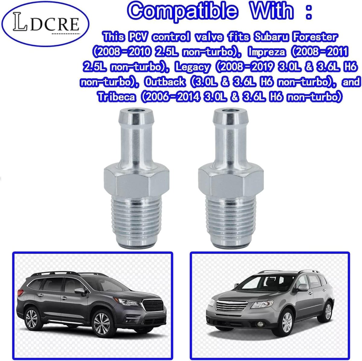 Compatible With: This PCV control valve fits Subaru Forester (20082010 2.5L non-turbo), Impreza (20082011 2.5L non-turbo), Legacy (20082019 3.0L & 3.6L H6 non-turbo), Outback (3.0L & 3.6L H6 non-turbo), and Tribeca (20062014 3.0L & 3.6L H6 non-turbo).. Replace OE: The PCV valve replaces part number 11810AA100 and is engineered as a direct-fit alternative to genuine Subaru OEM parts.. : The 11810AA100 valve is manufactured from durable, high-temperature-resistant materials that ensure long-lasting operation under extreme engine conditions.. Function: This valve regulates crankcase pressure by controlling air and vapor flow, reducing engine sludge and emissions while improving combustion efficiency.. Package include: 2 PCV Control Valve (Part Number: 11810AA100), securely packaged and ready for immediate installation..Other fine products