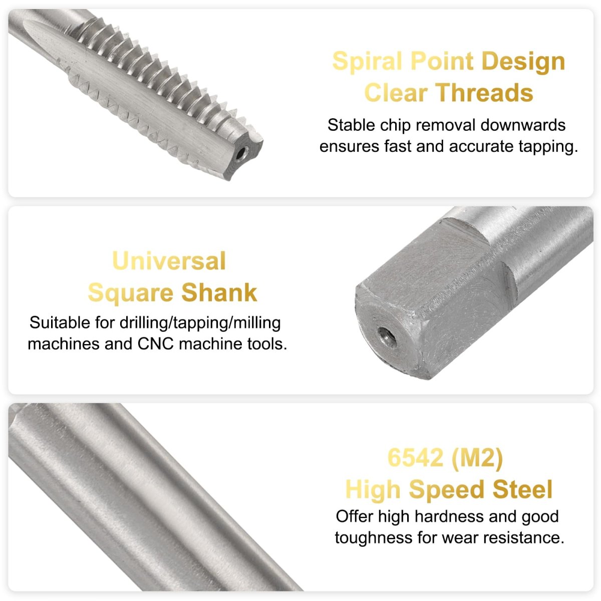 Spiral Point Tap Size: Thread Size: 3/8-16 UNC, Shank Side Width: 6mm / 0.24 inch, Thread Length: 25mm / 1 inch, Total Length: 80mm / 3.1 inch, Accuracy: B2. 6542 (M2) High Speed Steel: Made of high-speed steel, the tapping bit has high hardness, toughness and wear resistance, and can stably remove chips during cutting. Uncoated taps only have a base substrate, which is very suitable for a wide range of applications.. Features: Thread tapping bit features spiral point, plug chamfer and right hand thread cutting. Straight groove taps can remove chips downward, with clear threads and sharp cutting edges, ensuring fast and accurate tapping. The grooves on the tap facilitate the removal of chips and debris from the hole.. Applications: Screw tap can be used for drilling and tapping of stainless steel, aluminum, cast iron, alloy steel, ordinary steel, non-ferrous metals, hard plastics, etc. Suitable for drilling machines, tapping machines, CNC machine tools and milling machines. Use with tapping oil to improve processing accuracy and reduce the probability of breakage.. Tips: It is recommended to use a machine tap with a tap chuck with overload protection function. The tapping angle should be 90 degrees vertical and stable, and the tapping depth should not exceed 1.5 times the tap diameter..Other fine products