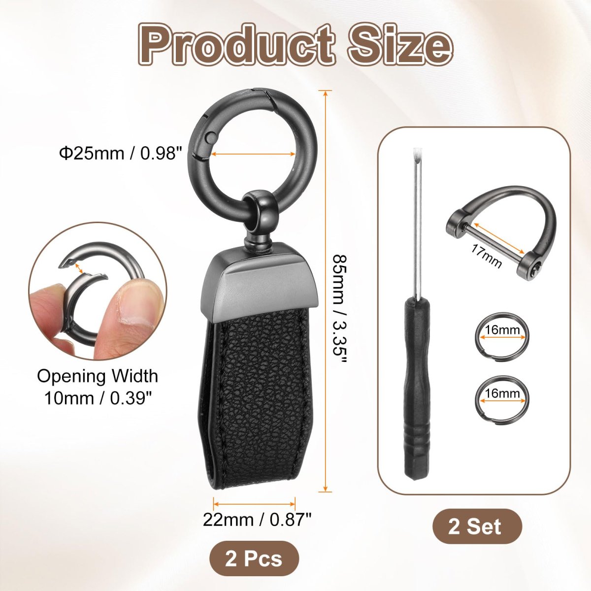 Package and Size: Length: 85mm / 3.35inch; Strip Width: 22mm / 0.87inch; Opening Width: 10mm / 0.39inch; Metal Ring Size: 27x20mm / 1.06x0.79inch (OD*ID); Package Content: 2Pcs x Car Key Chain; 1Pcs x Screwdriver. Material: This car keychain is made of durable zinc alloy and treated with electroplating process, with smooth surface, rust-proof, scratch-resistant, not easy to break and fade, and comfortable touch, so you don't have to worry about damaging the car key and can use it with confidence. Easy to Use: Use the screwdriver included in the package to unscrew the screw in the D ring, then hang the car key in the D ring, press the O-ring to insert the D ring into it and tighten the screw to complete the installation. If necessary, you can also hang other family keys on the two small key rings. Anti-Lost D-Ring: The wear-resistant and sturdy D-shaped ring is specially designed for various car key installations, and the thread design makes it link more tightly and will not fall off automatically. At the same time, its beautiful appearance also makes it suitable as a decoration hanging on a backpack or belt, adding a sense of fashion to you. Wide Application: This keychain is small and beautiful, suitable for most car keys on the market, such as motorcycle keys, truck keys, bicycle keys, RV keys, etc. You can also use it as office keys, home keys, locker keys and other small tools to help you save and carry keys and keep them organized.