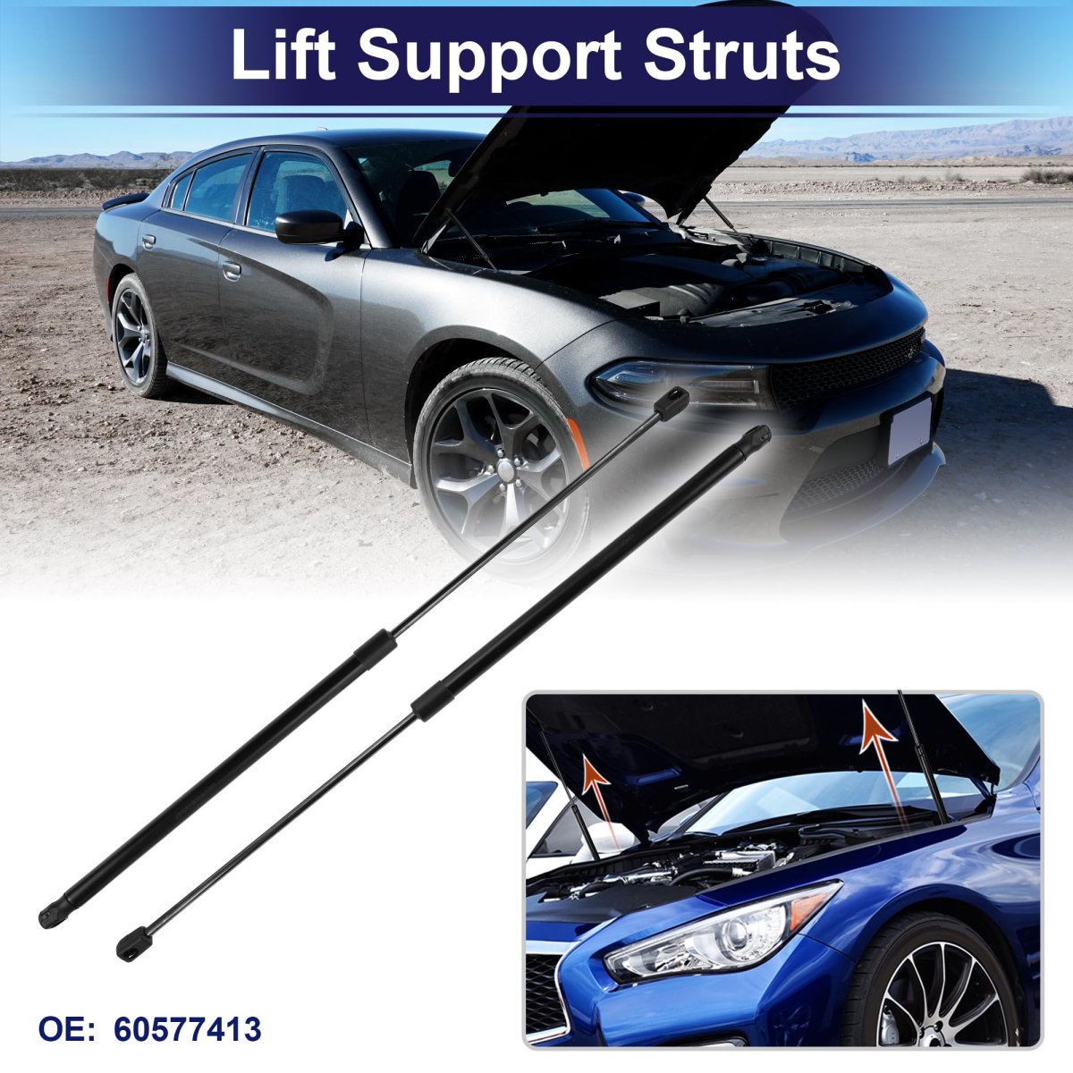 Fitment:for Alfa Romeo GTV (916C_) Coupe 1994-2005. OE Number:60577413. Specification:Extend length: 66cm/ 25.98", Compressed length:37cm/14.57"; Color: Black; Placement on vehicle: Front Hood. Product Characteristics:Gas Springs printed a waterproof material on the surface, dustproof, easy to clean. Lift Support Strut is made of durable Carbon Steel material, strong and durable to support Front Hood.. Package List:2Pcs Lift Supports Strut.Other fine products