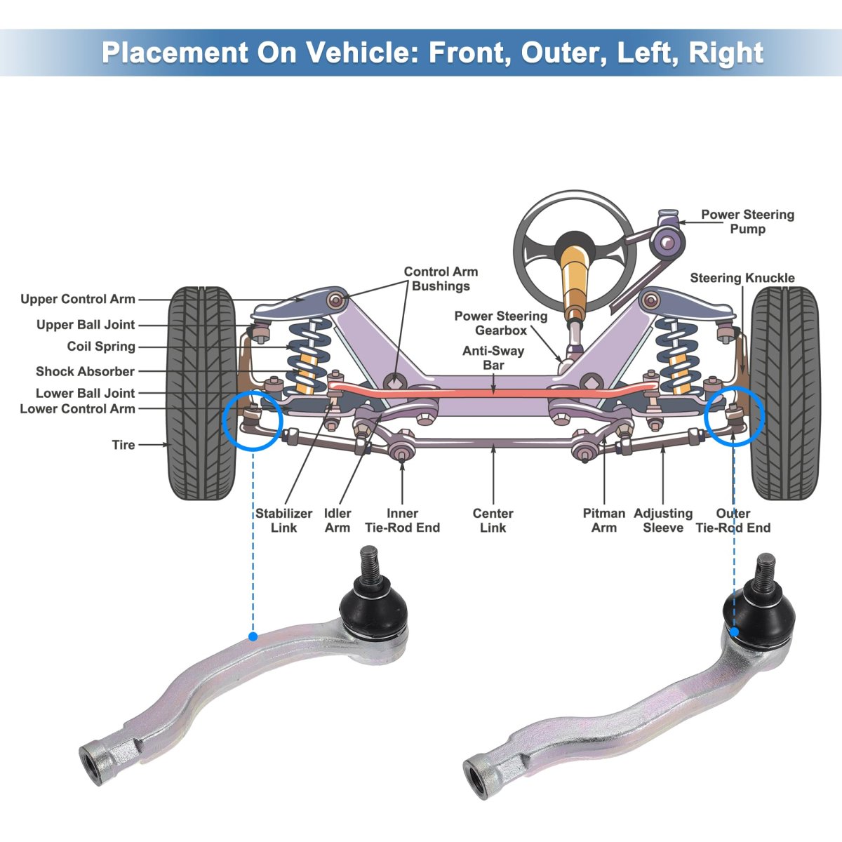 FITMENT: The Tie Rod End Links Kit is fit for Honda Civic 1992-2000, for Acura EL 1997-2001, for Acura Integra 1994-2001, for Honda CR-V 1997-2001, for Honda Fit 2009-2014, for Honda Insight 2010-2014. OE Number:ES3332R/ES3331R/53560S04003/53540S04003; PLACEMENT ON VEHICLE: Front, Outer, Left, Right. FUNCTION: Steering Tie Rod is used to cushion the impact transmitted from the uneven road surface to the frame or the body, and to reduce the vibration generated to ensure the smooth running of the vehicle.. PACKAGE INCLUDES: 2 x Front Outer Tie Rod Ends Links. INSTALLATION: Manual not included, you can loosen the pinch nut and remove the cotter pin, remove the castle nut and the outer tie rod end, then remove the boot and remove the outer tie rod end. At last, replace a new tie rod and install it back according to the method of disassembly..Other fine products