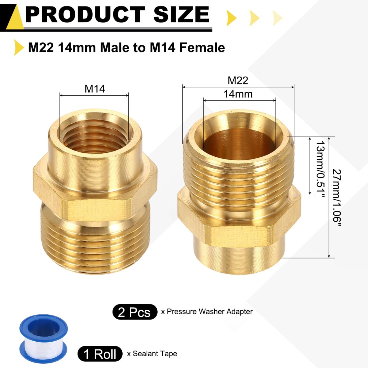 - 2pcs Pressure Washer Adapter M22 14mm Male To M14 Female Quick Connect Fittings Brass Swivel With Sealant Tape For Power