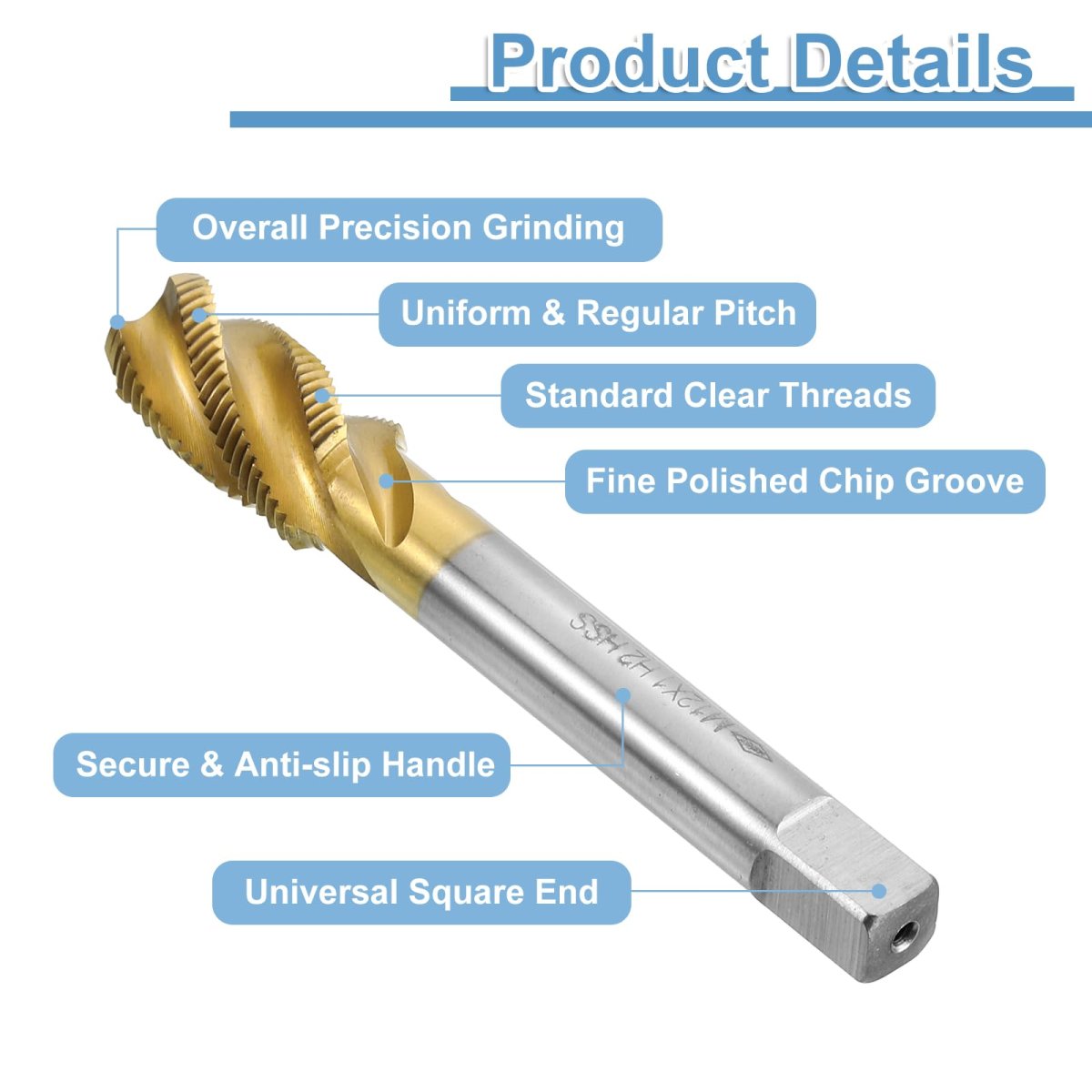 Spiral Flute Tap: Thread size: M12 x 1 (right hand), accuracy: H2; thread length: 32mm / 1.26"; total length: 80mm / 3.15"; square shank width: 7mm / 0.28". Spiral flutes are fully ground to provide upward chip removal, with clear threads and sharp cutting edges.. 6542 (M2) High Speed Steel: Run at high speeds and generate threads quickly and efficiently, offering high hardness, wear resistance, and good toughness. Titanium coating provides excellent corrosion resistance, and reduces the coefficient of friction for smoother tapping.. Applications: Thread taps are great for processing blind holes and sticky materials. Used for drilling and tapping stainless steel, aluminum, alloy steel, ordinary steel, cast iron, non-ferrous metals, hard plastics, etc. Flutes on the screw tap help to remove chips and debris from the hole.. Machine Tap: Suitable for drill presses, tapping machines, CNC and milling machines. Used with tapping oil to get higher quality threads and more durable taps. Machine taps are suggested to be used with tap chucks with overload protection. Not recommended for hand use and electric drill tapping.. Tips: Tapping angle should be 90 degrees vertical and stable. The tapping depth should not exceed 1.5 times the diameter of the tap. Control the speed according to the material hardness. The higher the hardness, the slower the speed..Other fine products