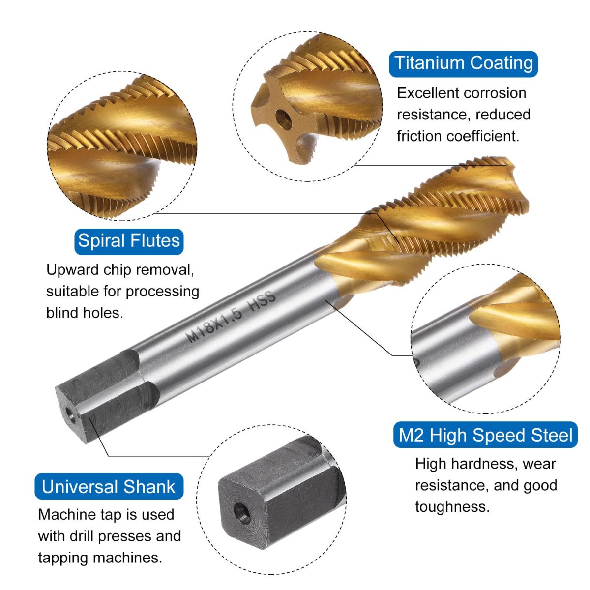 Spiral Flute Tap: Metric thread size: M18 x 1.5 (right hand), accuracy: H2; thread length: 35mm / 1.38"; total length: 110mm / 4.33"; square shank width: 11mm / 0.43". Spiral flutes are fully ground to provide upward chip removal, with clear threads and sharp cutting edges.. M2 (6542) High Speed Steel: Run at high speeds and generate threads quickly and efficiently, offering high hardness, wear resistance, and good toughness. Titanium coating provides excellent corrosion resistance, and reduces the coefficient of friction for smoother tapping.. Applications: Thread taps are great for processing blind holes and sticky materials. Used for drilling and tapping stainless steel, aluminum, alloy steel, ordinary steel, cast iron, non-ferrous metals, hard plastics, etc. Flutes on the screw tap help to remove chips and debris from the hole.. Machine Tap: Suitable for drill presses, tapping machines, CNC and milling machines. Used with tapping oil to get higher quality threads and more durable taps. Machine taps are suggested to be used with tap chucks with overload protection. Not recommended for hand use and electric drill tapping.. Tips: Tapping angle should be 90 degrees vertical and stable. The tapping depth should not exceed 1.5 times the diameter of the tap. Control the speed according to the material hardness. The higher the hardness, the slower the speed..Other fine products