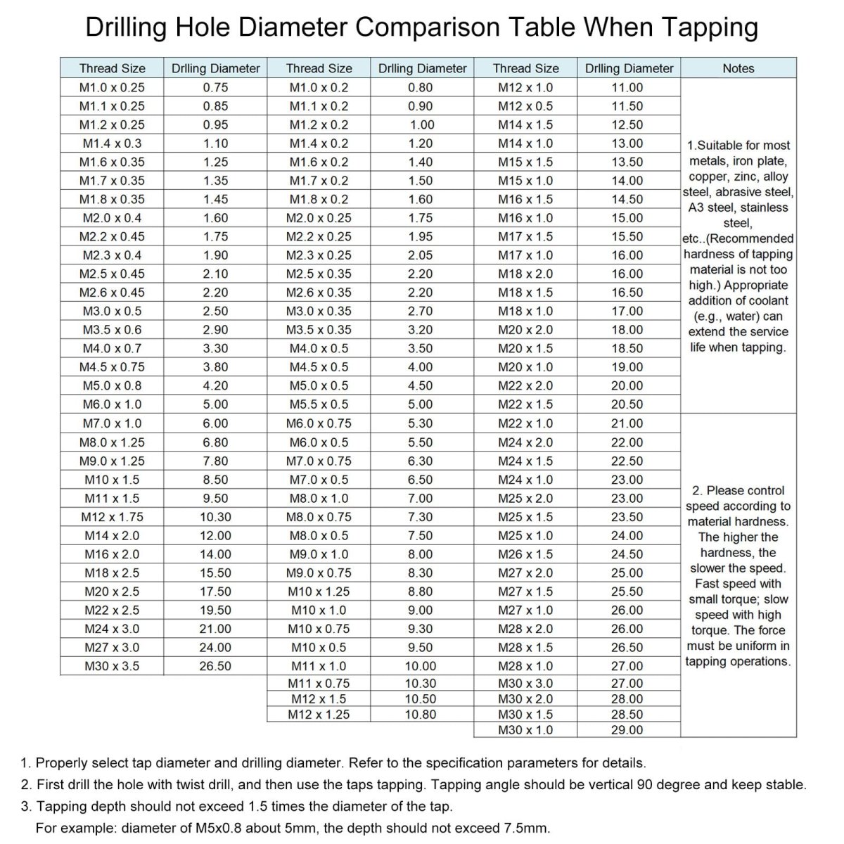 Thread Tap Size: Metric thread size: M8 x 1.25 (right hand); thread length: 26mm / 1.02"; total length: 120mm / 4.72"; square shank width: 6mm / 0.24"; accuracy: H2. Straight Flute Tap: The tapping tool adopts straight flute design, clear threads, and right hand cutting direction. Threading tap provides rapid downward chip removal to achieve efficient thread cutting, suitable for processing through holes or shallow holes.. Wide Applications: Screw thread tap can create new threads or re-thread damaged or jammed threads. Widely used for most metals, iron plate, copper, zinc, alloy steel, abrasive steel, A3 steel, stainless steel, etc.. Add proper tapping oil for higher quality internal threads and more durable taps.. Material & Finish: 6542 (M2) high speed steel tap offers high hardness and excellent wear resistance for durability and longevity, and good cutting performance for clean, precise holes. Titanium coating offers enhanced hardness, corrosion and rust resistance, heat resistance, and reduced friction for smoother tapping.. Tips: Machine tap is used with drill presses, tapping/CNC/milling machines. NOT recommended for hand and electric drill tapping. The higher the hardness, the slower the speed. Drill the holes with a twist drill bit first, then tap with a thread tap. The tapping angle should be 90 degrees vertical and stable..
