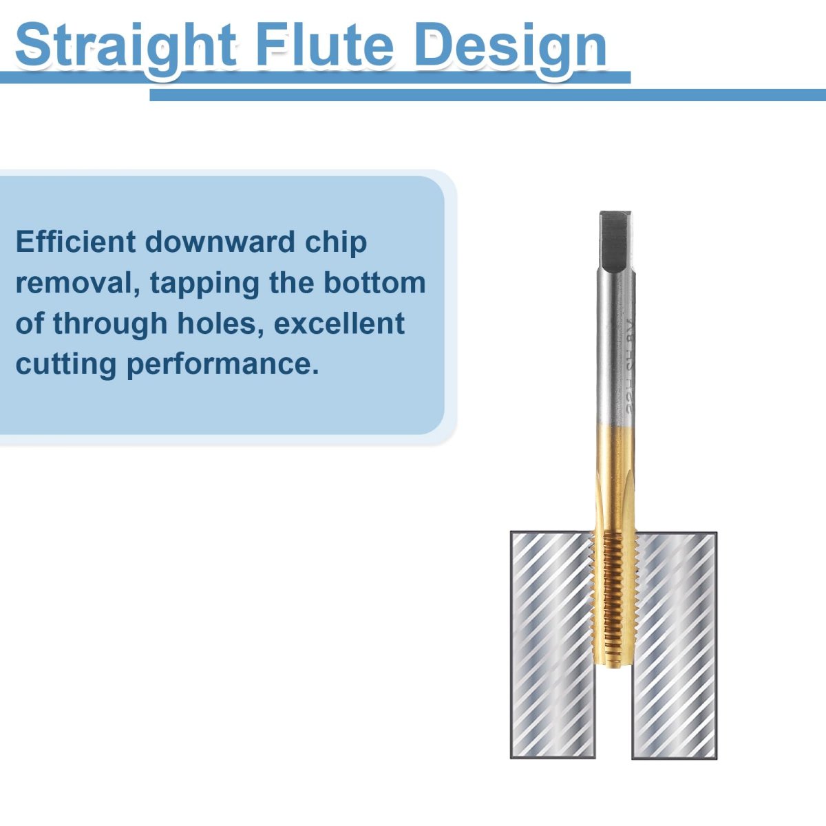 Thread Tap Size: Metric thread size: M8 x 1.25 (right hand); thread length: 22mm / 0.87"; total length: 71mm / 2.8"; square shank width: 6mm / 0.24"; accuracy: H2. Straight Flute Tap: The tapping tool adopts straight flute design, clear threads, and right hand cutting direction. Threading tap provides rapid downward chip removal to achieve efficient thread cutting, suitable for processing through holes or shallow holes.. Wide Applications: Screw thread tap can create new threads or re-thread damaged or jammed threads. Widely used for most metals, iron plate, copper, zinc, alloy steel, abrasive steel, A3 steel, stainless steel, etc.. Add proper tapping oil for higher quality internal threads and more durable taps.. Material & Finish: 6542 (M2) high speed steel tap offers high hardness and excellent wear resistance for durability and longevity, and good cutting performance for clean, precise holes. Titanium coating offers enhanced hardness, corrosion and rust resistance, heat resistance, and reduced friction for smoother tapping.. Tips: Machine tap is used with drill presses, tapping/CNC/milling machines. NOT recommended for hand and electric drill tapping. The higher the hardness, the slower the speed. Drill the holes with a twist drill bit first, then tap with a thread tap. The tapping angle should be 90 degrees vertical and stable..Other fine products