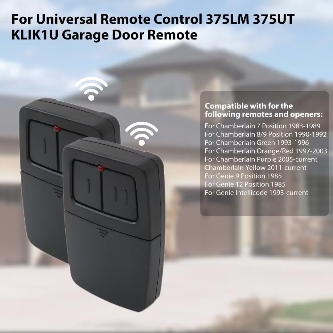 Product Overview: 2Pack Universal Clicker 375LM 375UT KLIK1U Garage Gate Door Opener Remote Dip for Chamberlain 7 Position 1983-1989. Compatible For Linear, For Craftsman, For Chamberlain, For Genie, For LiftMaster. Compatible Model: For Universal 375LM 375UT KLIK1U, For Clicker KLIK1U. Easy to follow programming instructions; Visor clip included.Other fine products