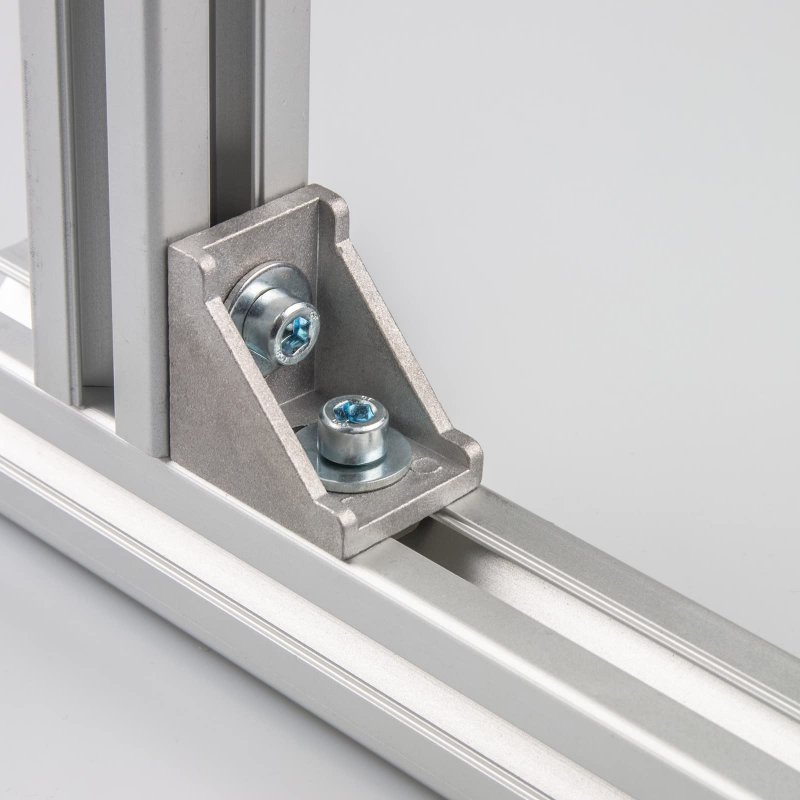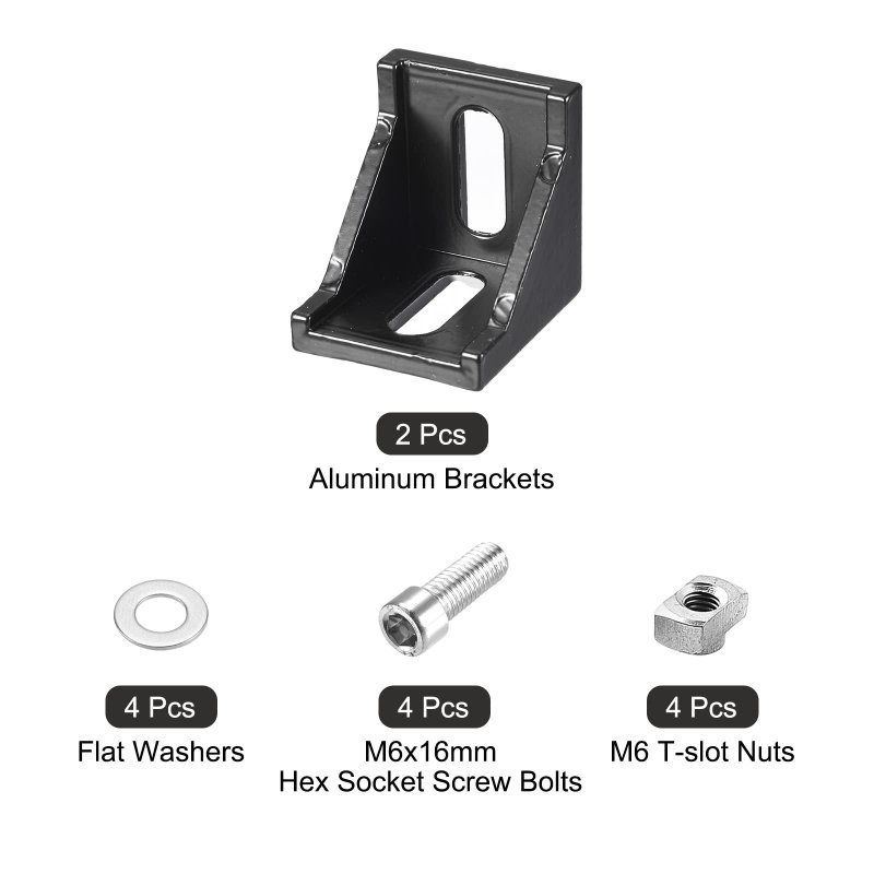 [Size] - 1.5" (38mm) long, 1.38" (35mm) wide, 1.5" (38mm) high, 2 Hole Quantity - 0.89"x0.33" (22.5x8.5mm) in long x wide. [Material] - Made of aluminum die casting alloy with a sandblasting surface, this aluminum corner bracket is of good rust resistance, high hardness, and long service life.. [Used for] - Used for the L or cross right-angle connection of two aluminum profiles or lock connection of heavy frames. Insert the two ends of the L-shaped angle bracket into the groove of the profile, and tighten the fixing screws to fix the two profiles.. [Application] - Suitable for standard 4040 series aluminum profiles with slot 8mm. Widely used for building industrial aluminum frame structures, 3D printers, CNC routers, CNC laser cutters, robotics projects, woodworking machinery, fish tank, etc.. [Package] - 2 Sets in the coming package: 2 x 4040 Aluminum Brackets, 4 x M6 T-slot Nuts, 4 x M6 x 16mm Hex Socket Screw Bolts, 4 x Flat Washers. You can install the brackets with bolts, nuts, or washers..