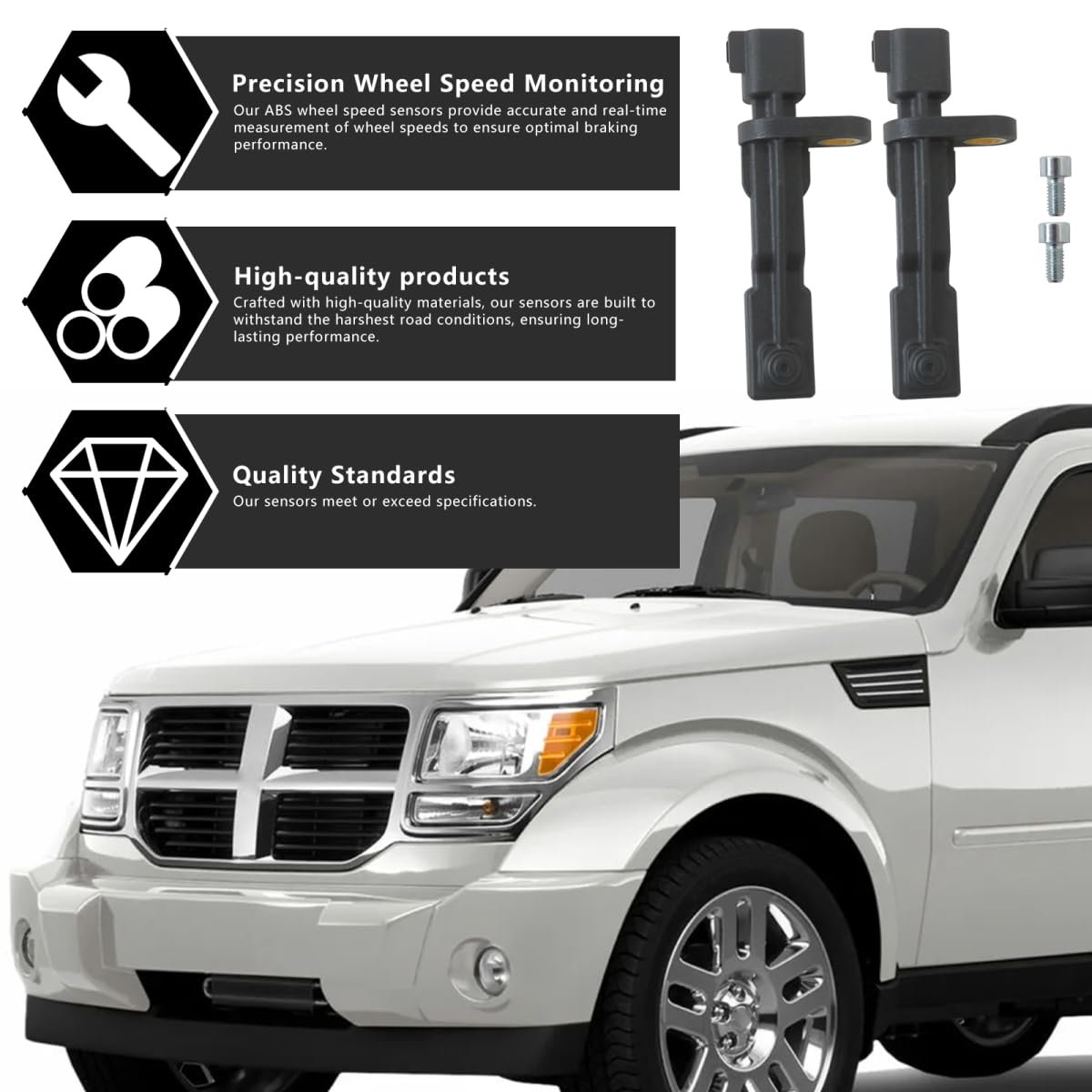 Product Information: 2x ABS Wheel Speed Sensor - Rear Left or Right Location, Fit for Jeep Wrangler 2007-2017 Fit for Jeep Liberty 2008-2012 Fit for Dodge Nitro 2007-2011 - Vicue New Version. Made of quality material for long service life. Excellent Workmanship: Crafted with high-quality materials and built to withstand harsh road conditions, ensuring both longevity and reliability in performance. Position: rear left driver side and right passenger side. Interchange Part Number: ALS1932 52125003AB SU9956 695-179 2411001 5S8494 SS20859 AB2048 ALS1932T FHCST50029.
