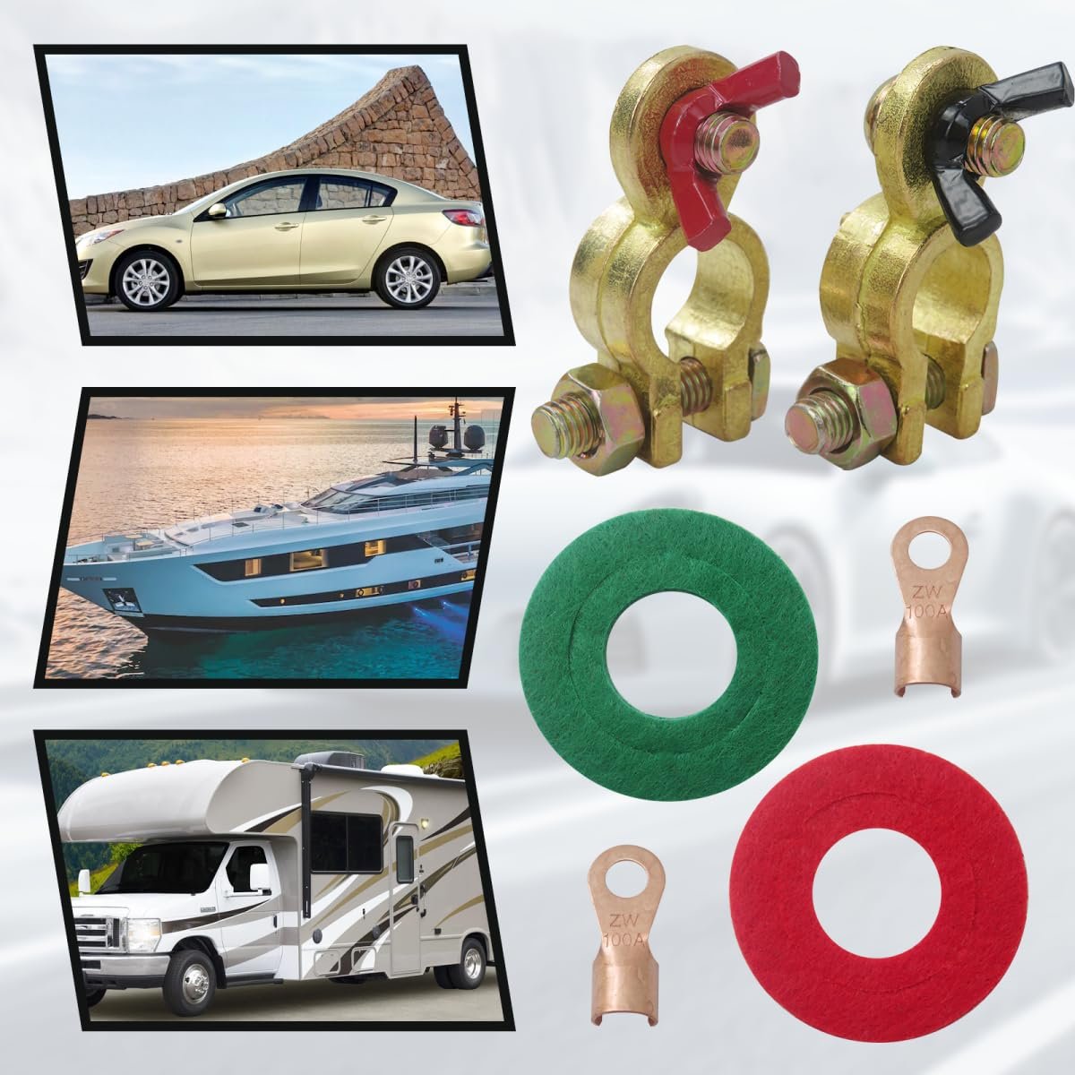 Battery Connector Wing Nuts: Battery terminals clamps with color-coded positive & negative wing nuts, which not only can help you identify positive and negative fast, also can help you quick and easy wire replacement without using a wrench.. Prevent C orrosion: With red & green battery terminal protect washer, can use for both top post batteries or cables and side post batteries or cables. Prevent c-orrosion around the battery terminals, prolong battery life.. Size: The diameter of the screw: 5/16" (8 mm). Positive Post: 19mm. Negative Post: 17mm.. Safe for Using: Easy installation and handling thanks to coated wing nuts, rubberized to minimize electric shocks. (Voltage: 12V or 24V, screw thread: M8.); Widely Used: Suitable for heavy-duty trucks, vans, cars, marine boats, engineering machinery, and many more.. WHAT YOU WILL GET: What you buy is not only a product, but also a whole set of our after-sales ser vice. Any questions, just one contact, we will always be there for you.Other fine products